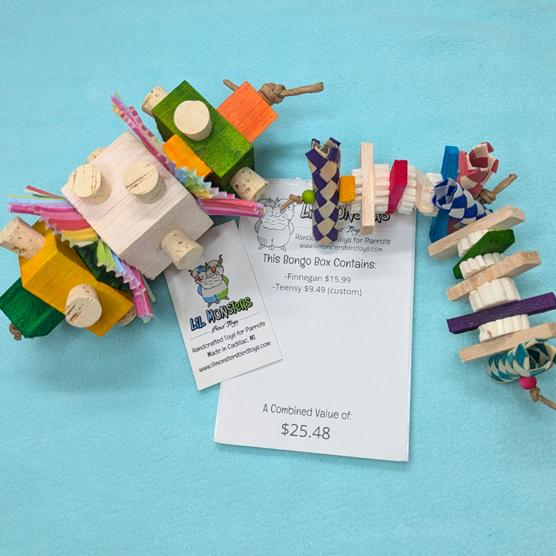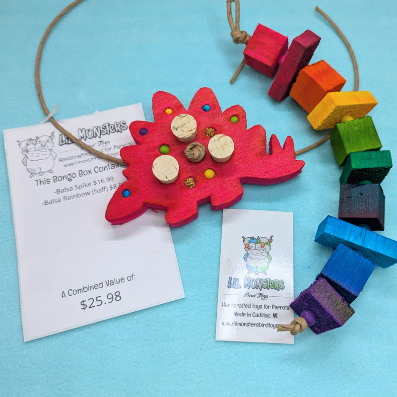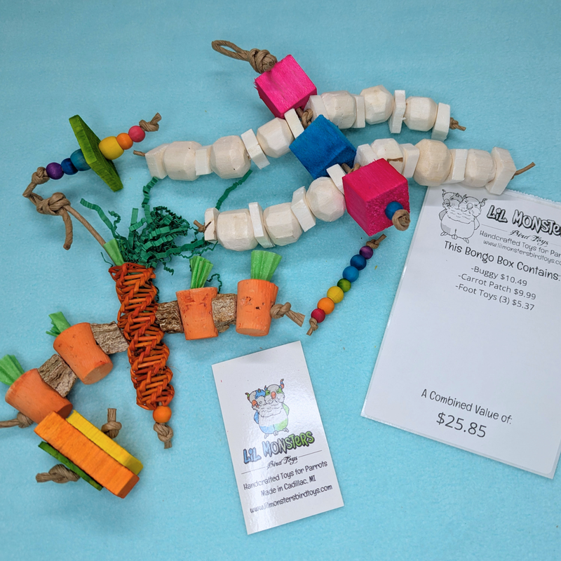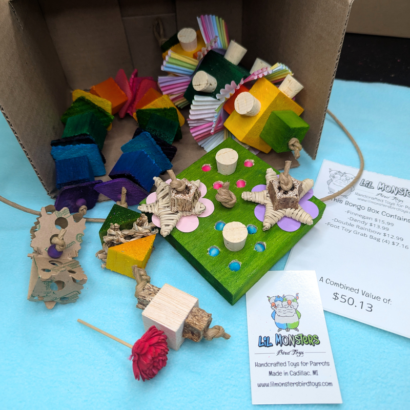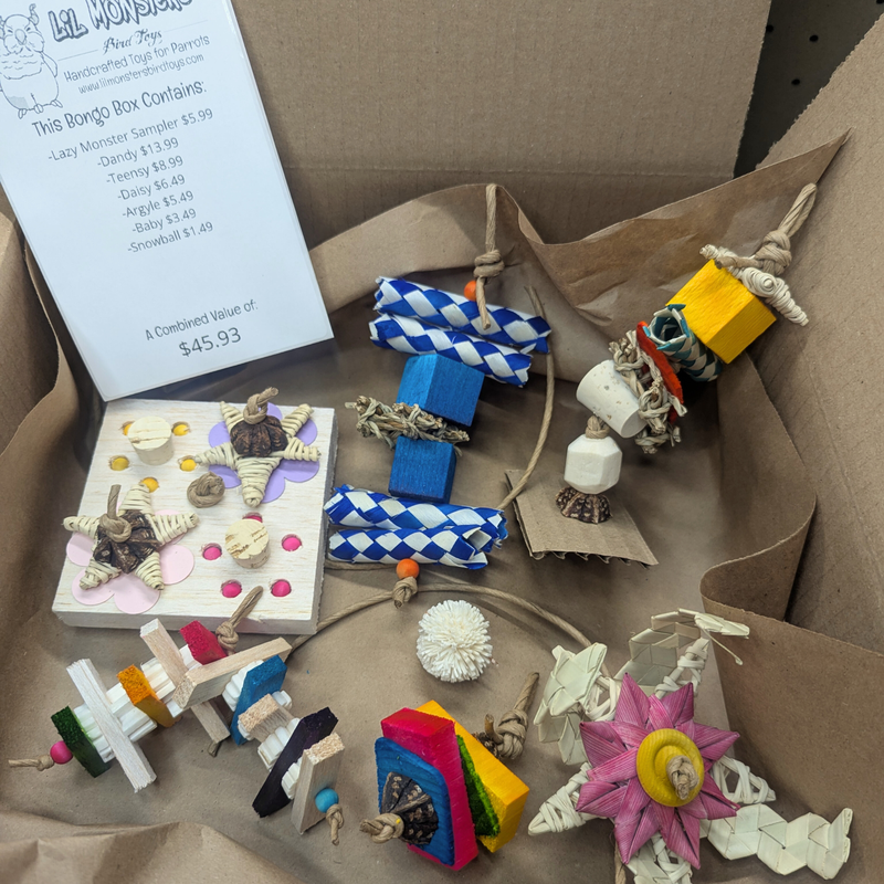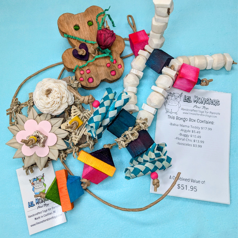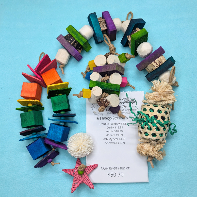 Every Bongo Box is built entirely around the information you provide at checkout, and we encourage you to be as detailed as possible when sharing your bird's likes, dislikes, and any restrictions. Species alone doesn't tell us much, as we have large bird customers who love shredding balsa and small bird customers who prefer hardwoods! The more you share, the better we can curate a box your flock will truly enjoy.