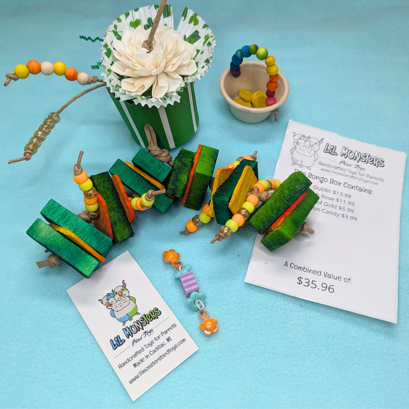 Every toy is handmade by us using bird-safe materials and food grade dyes. Since they are custom made, we can tailor toys to ensure they match your standards.