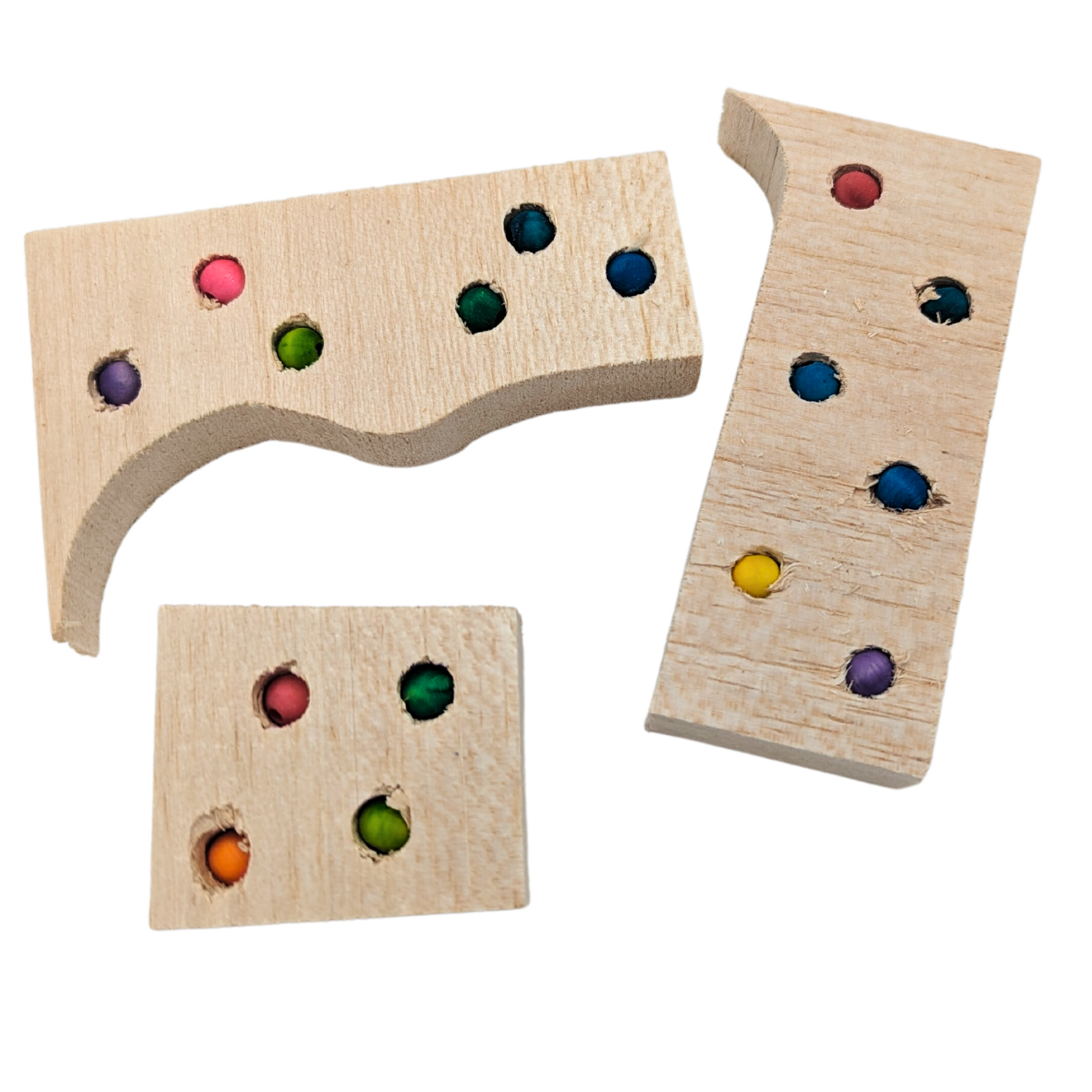 These toys are made primarily from the scraps created when cutting out balsa shapes. Each piece has 4-6 8mm dyed wooden beads embedded for your feathered friend to extract. They are perfect for a foot toy, floor toy, or you can drill a hole and add them to a skewer. Elevate the playtime fun and watch your birds get knotty with these colorful knots!