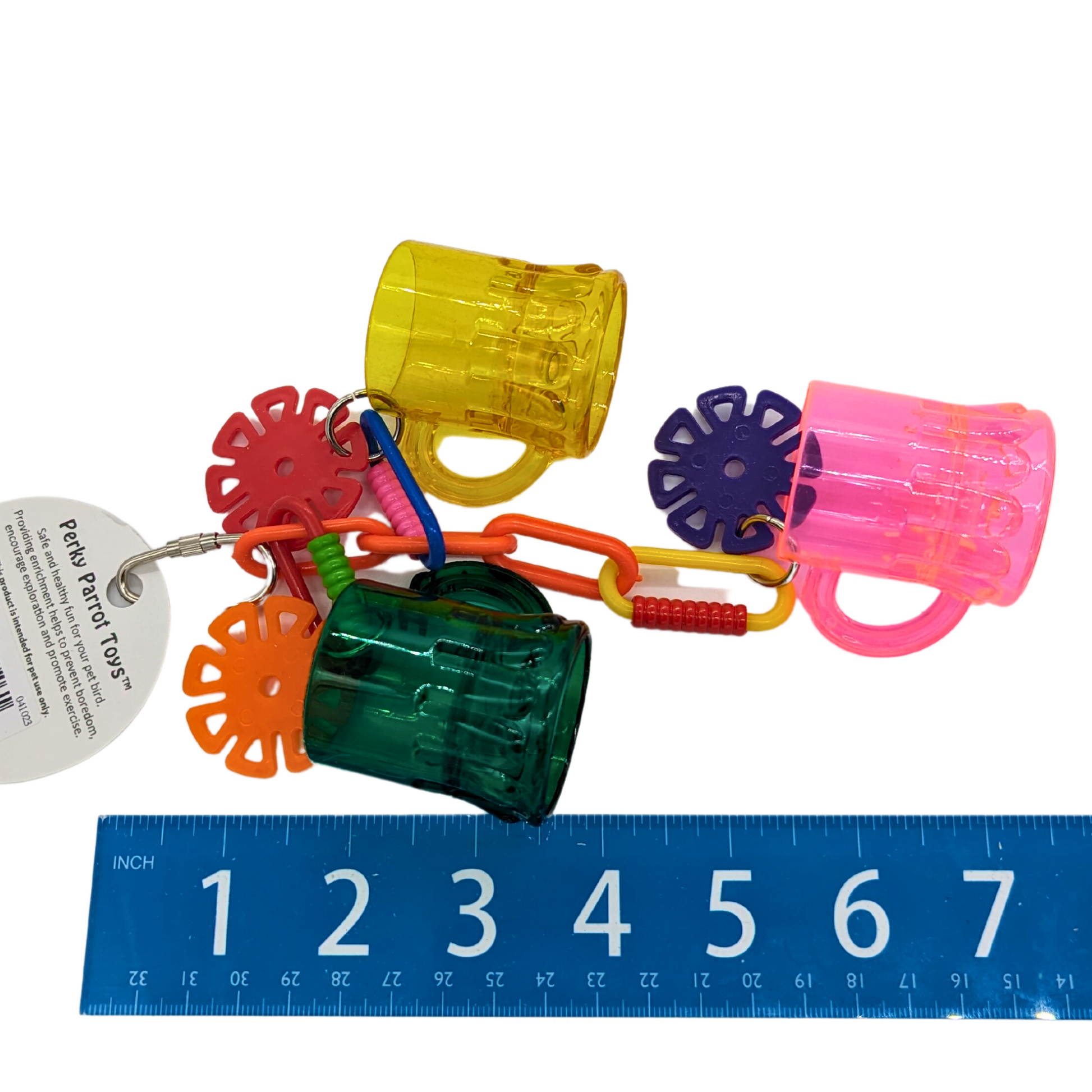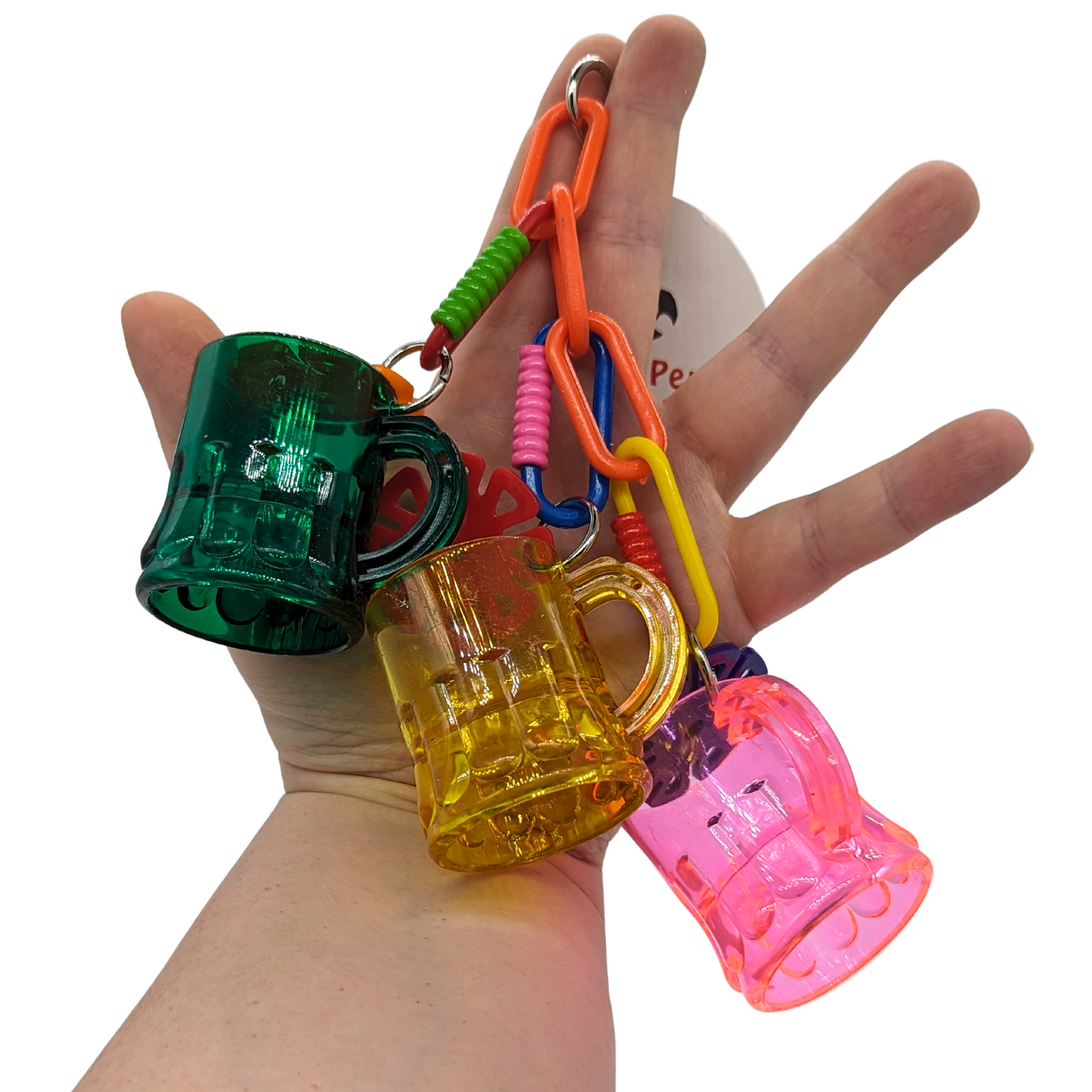 Toast your bird with our Cheers Sr. foraging toy. Charming mugs with lids dangle from sturdy plastic chain. Fill the cups with your bird's favorite treats to encourage foraging.