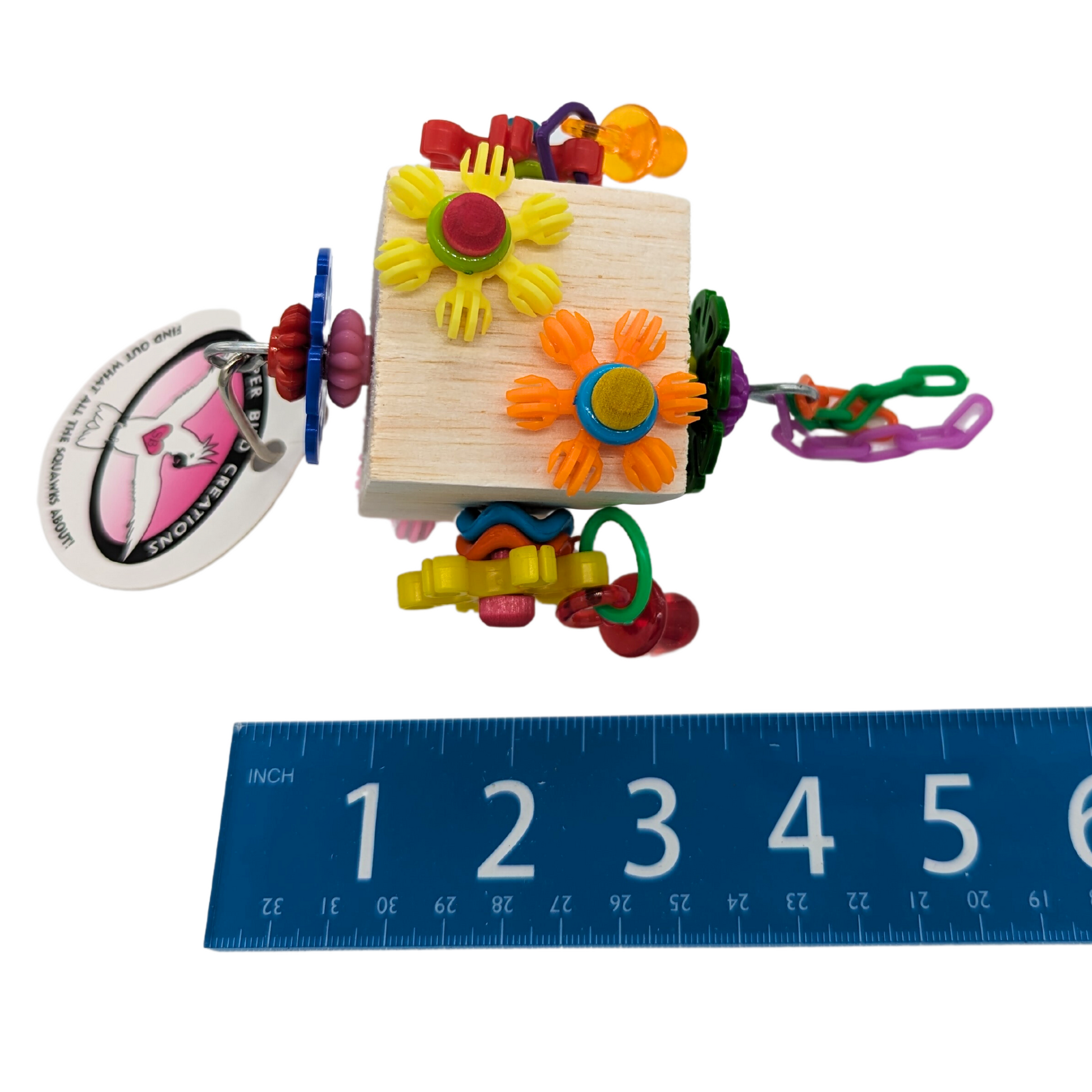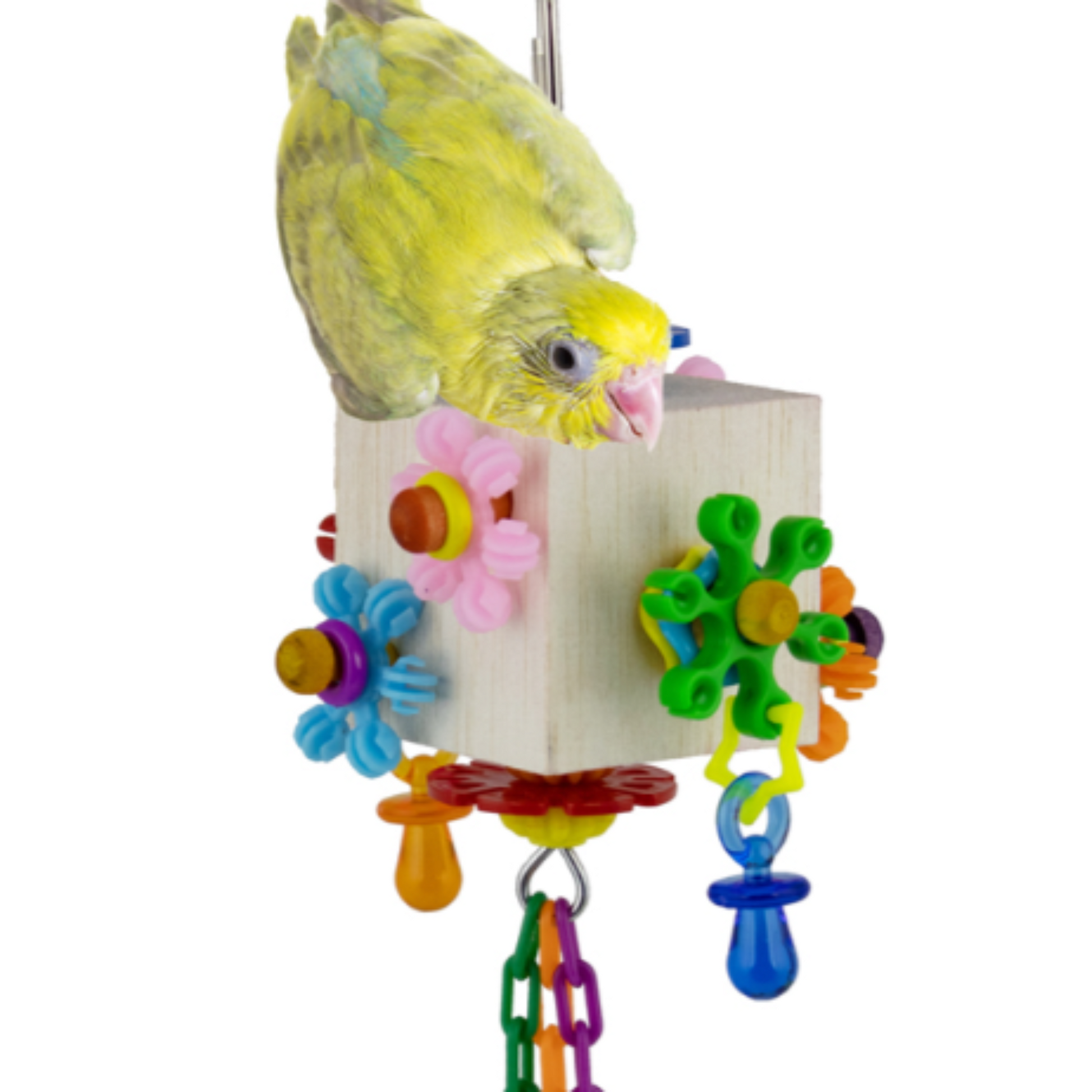 - This balsa block is covered with spinning daisy rings, gear beads and translucent pacifiers. Three strands of plastic chain dangle from the bottom for extra fun.