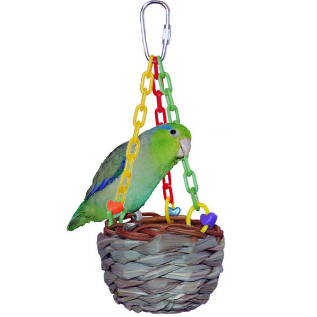 Adorable mini seagrass bowl suspended by colorful plastic chains. Stuff with a favorite treat to create a foraging toy for more fun.
