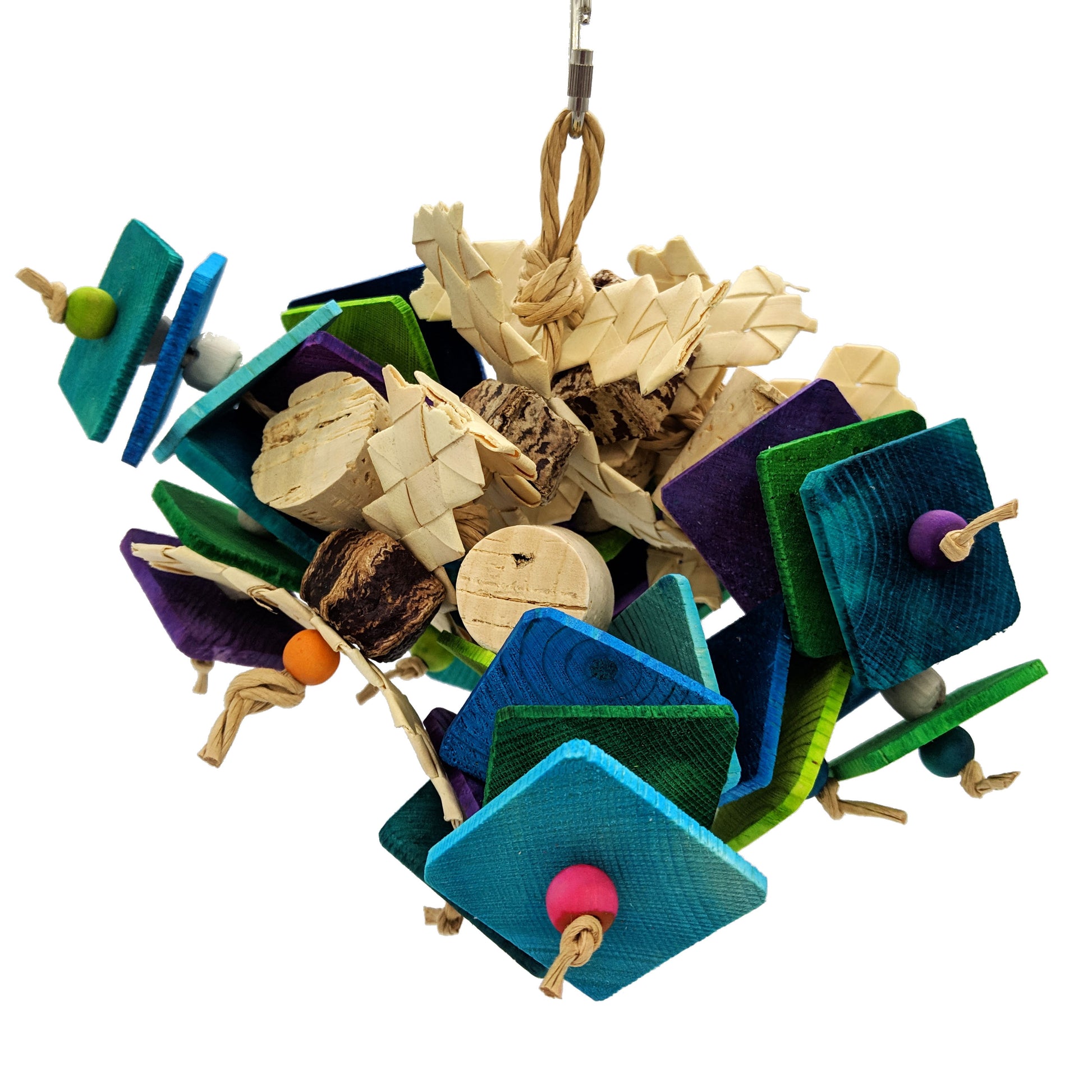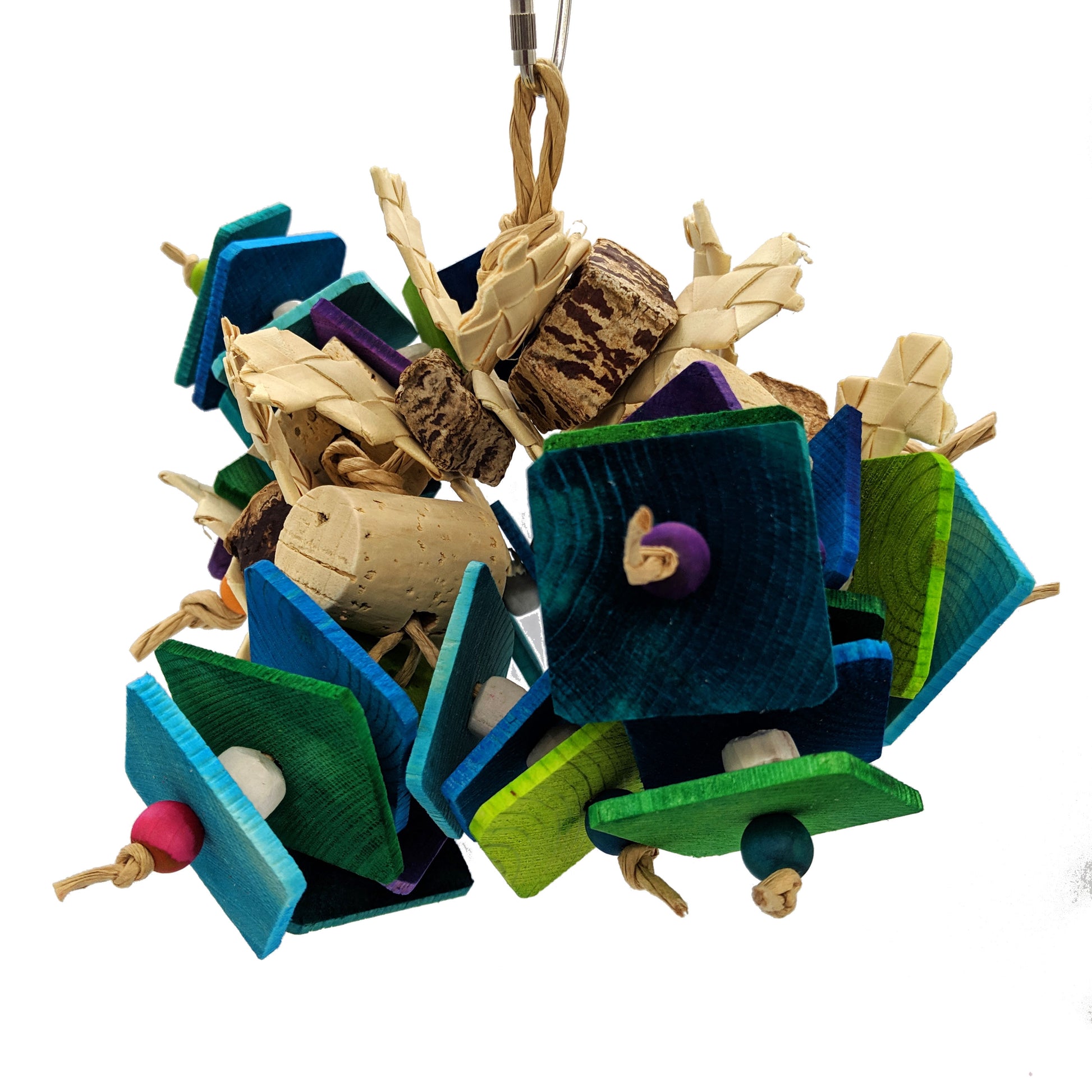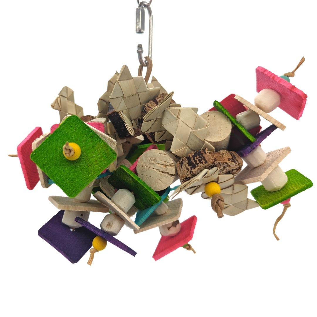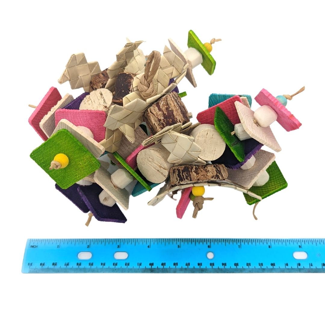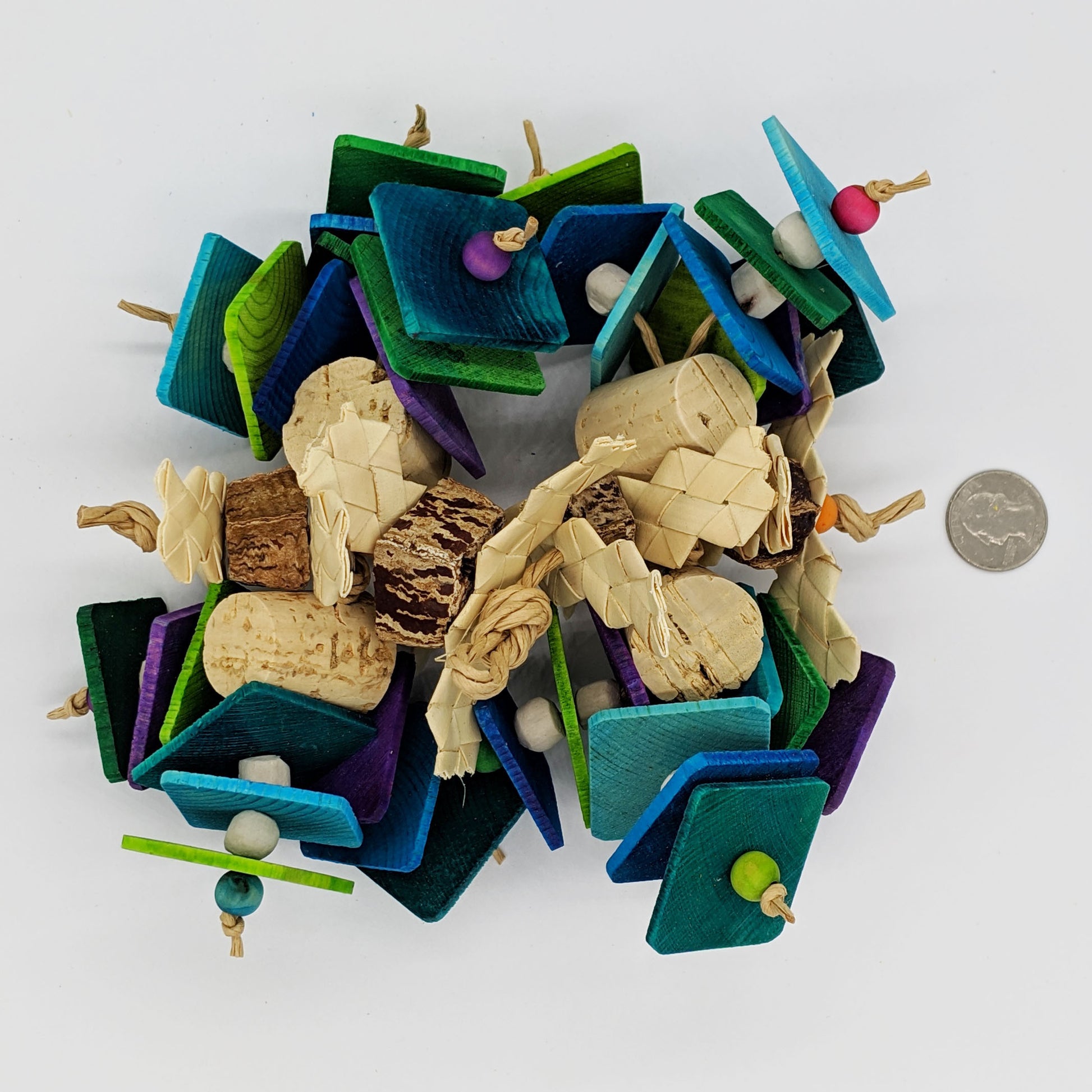 This toy is brimming with 1/8" thin pine slices, large cork stoppers, sola, palm, wood beads, and mahogany. All on paper rope.