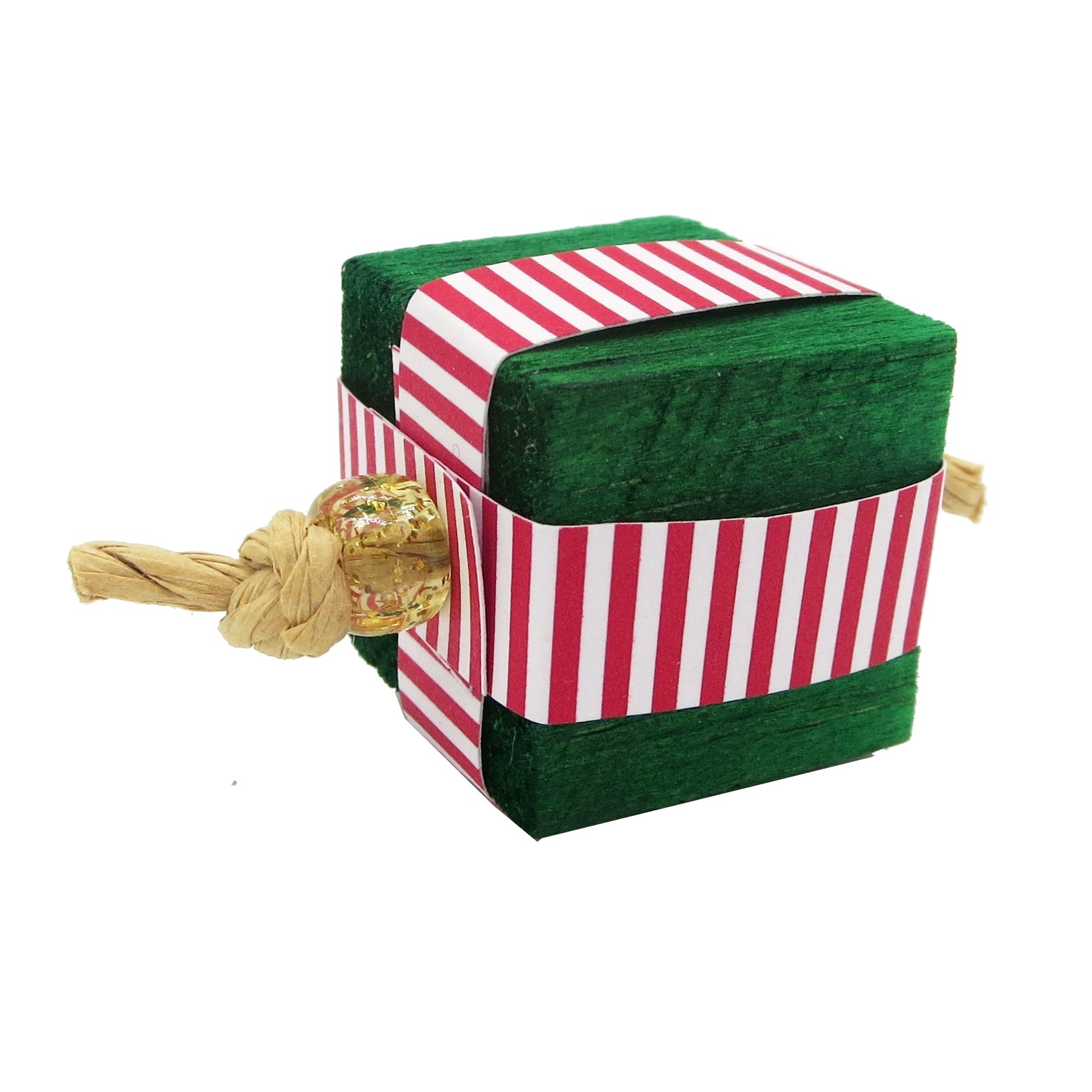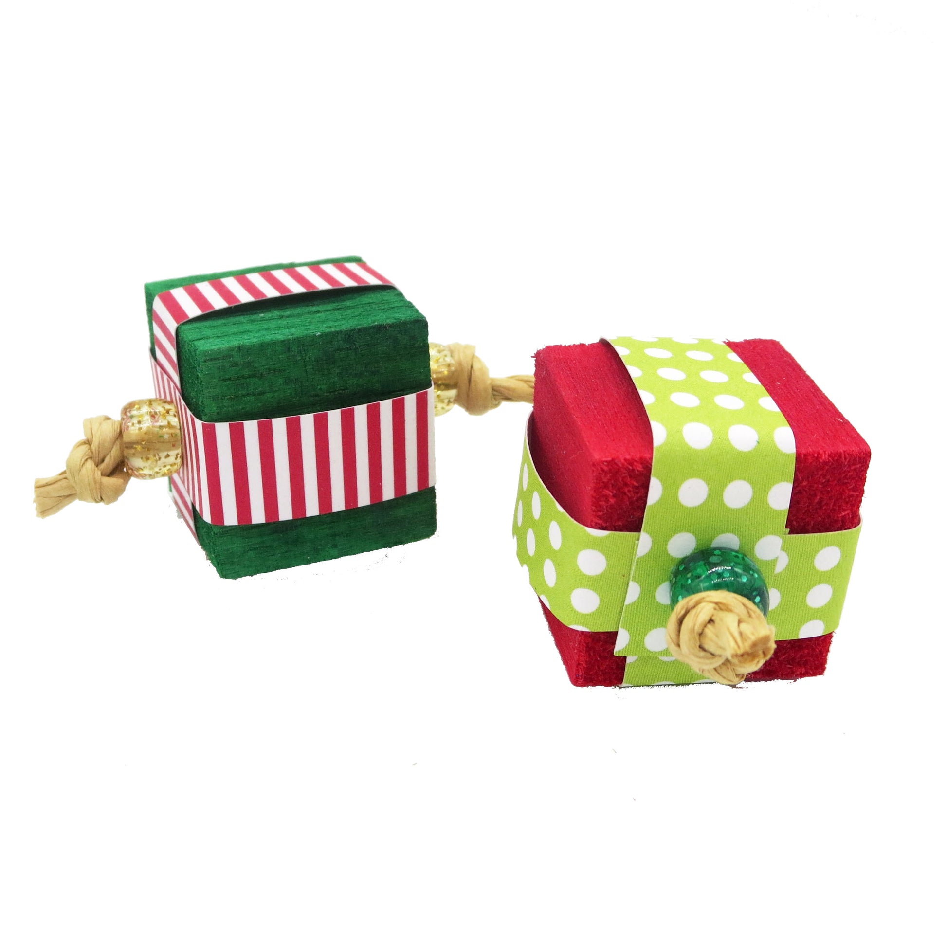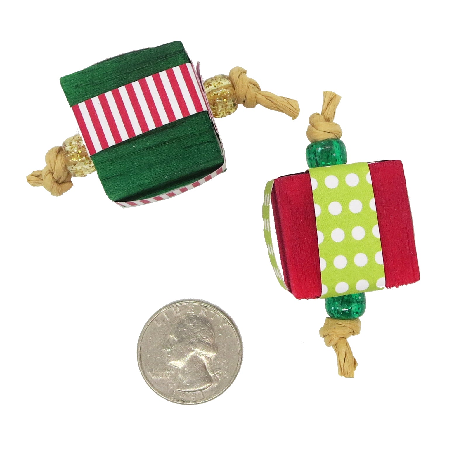 This toy is made with a balsa block, adorned with cardstock ribbon, sparkly pony beads, and tied with paper rope.