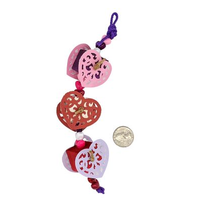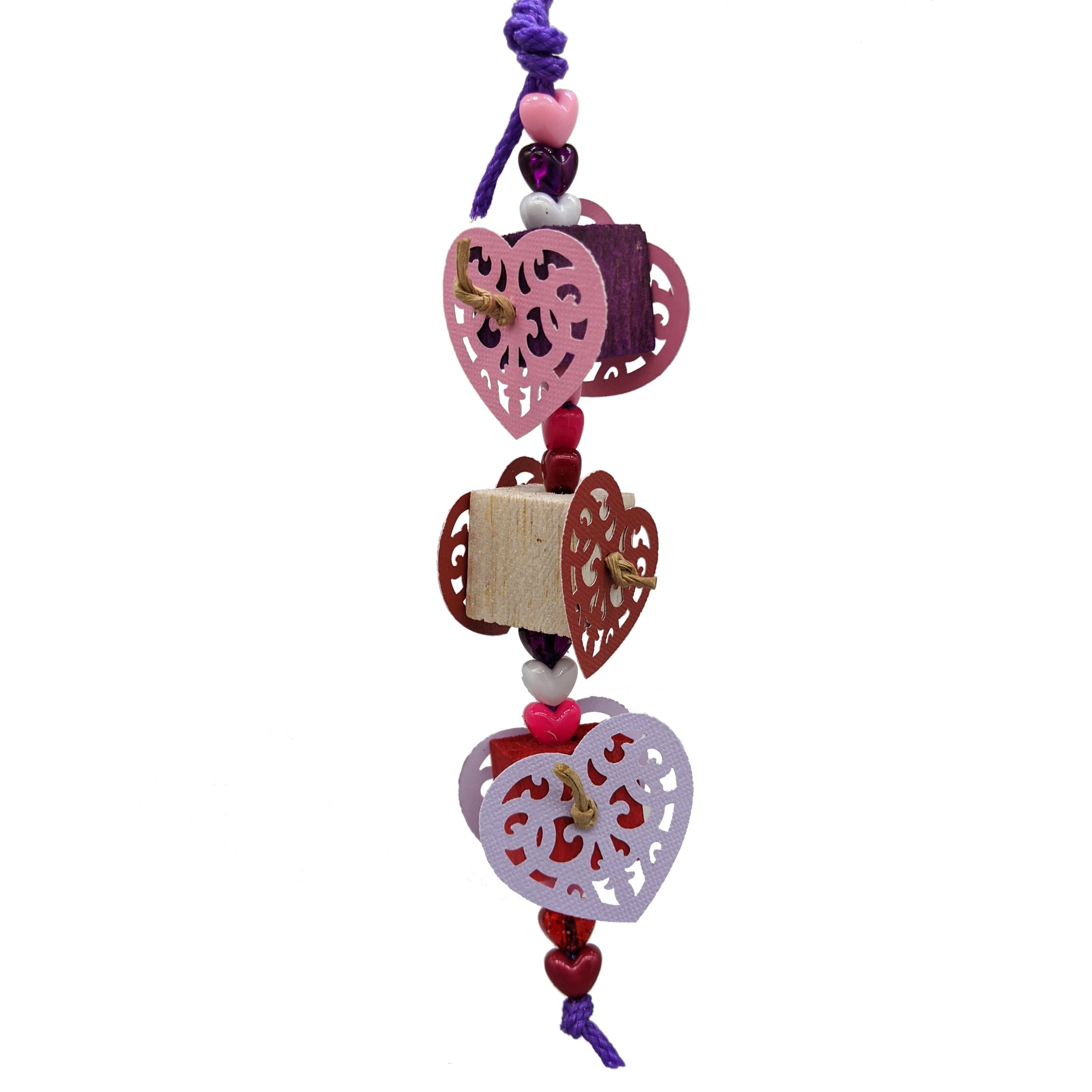 1" Balsa cubes are adorned with cardstock and heart pony beads, all strung on paper rope.