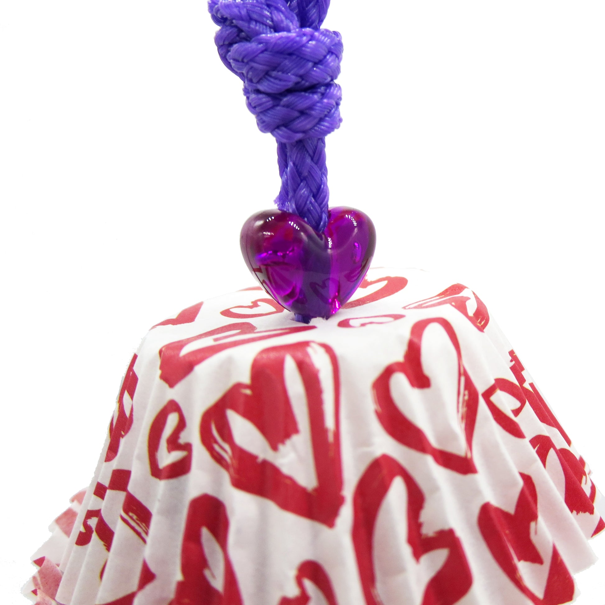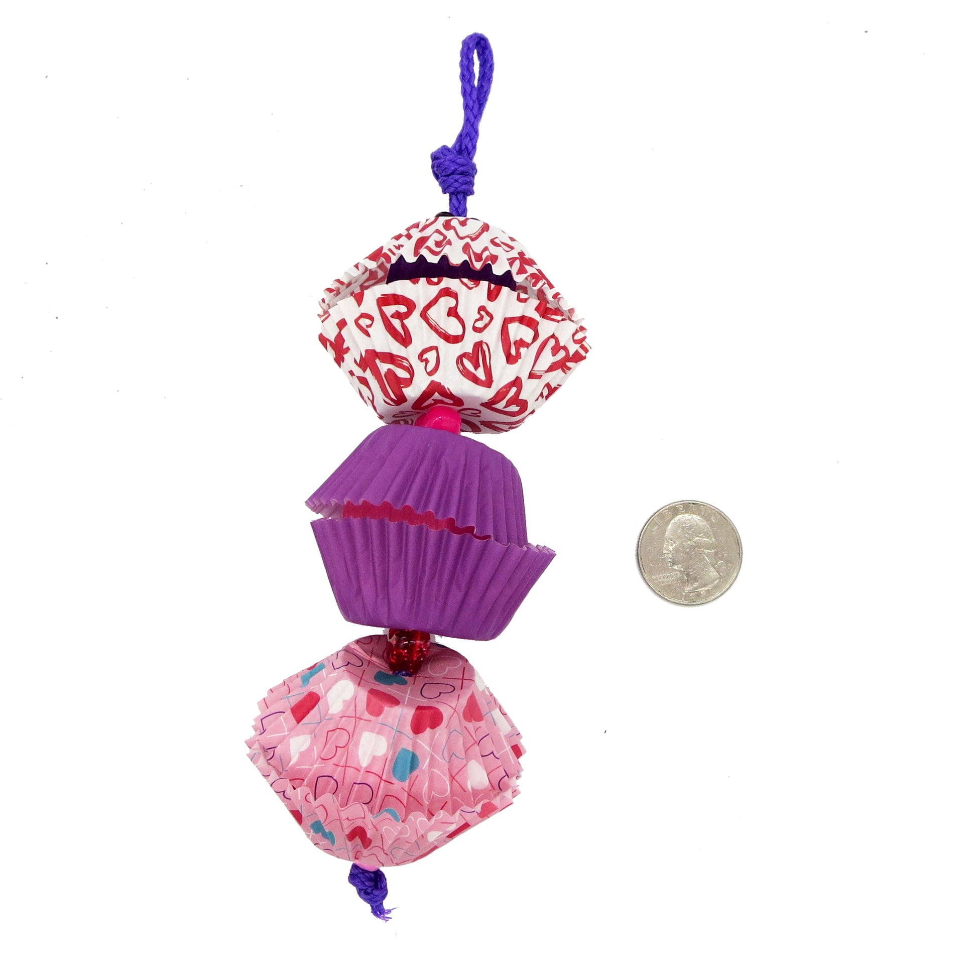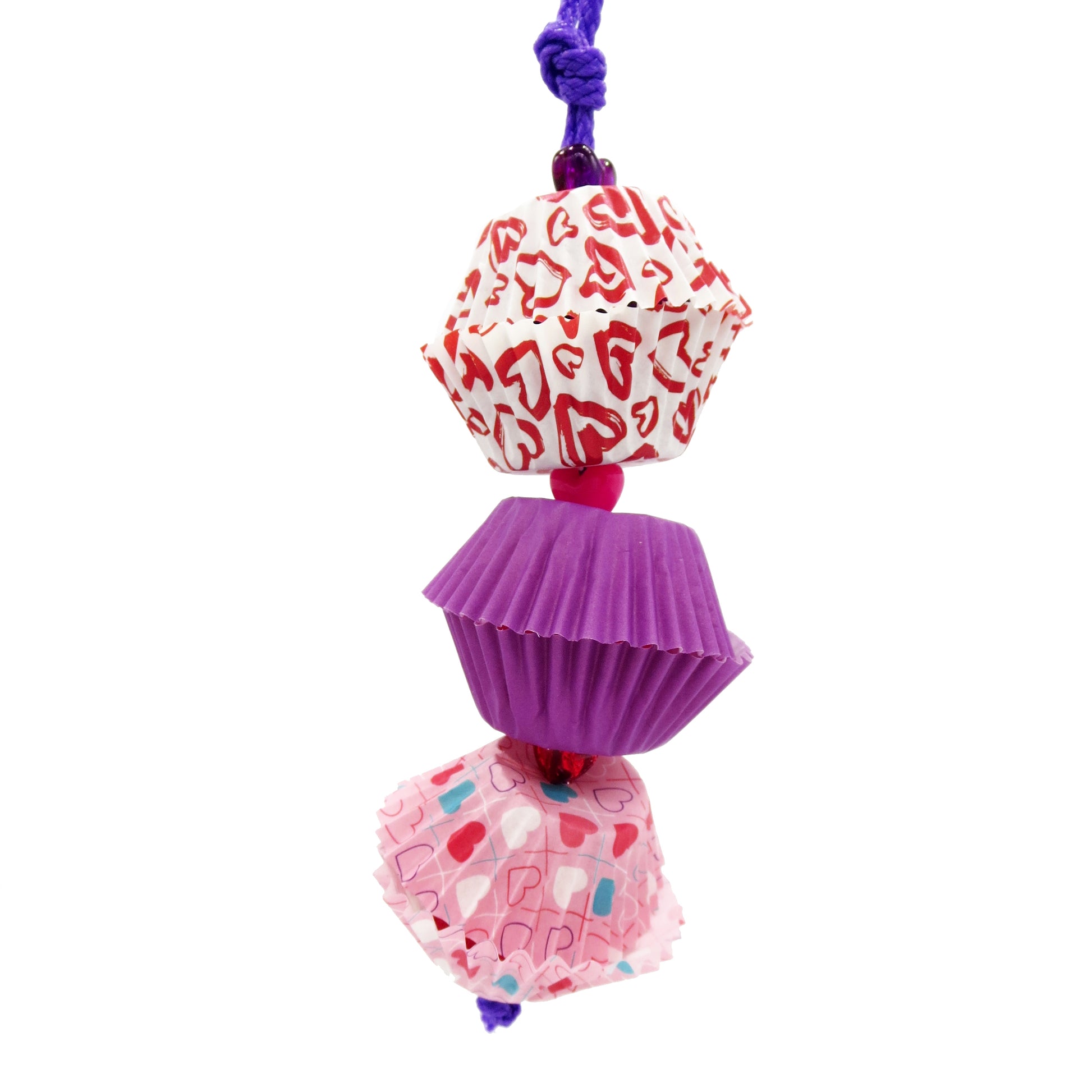 Nestled between cupcake liners are 1" balsa cubes for your bird to seek and destroy! Strung on paper rope with heart shaped pony beads.