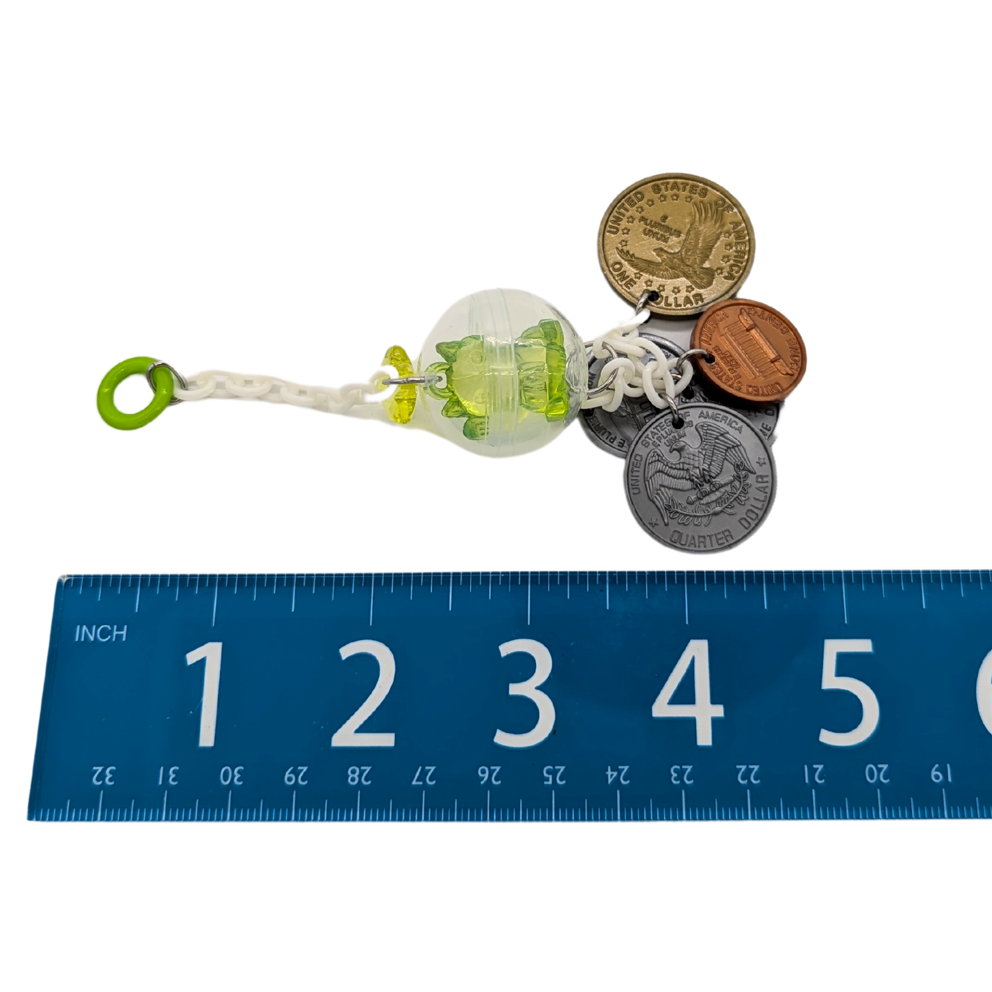 Everything is made from bird safe parts, from acrylic, stainless steel rings, and plastic school money (safe for kids to nom on... human or birb).