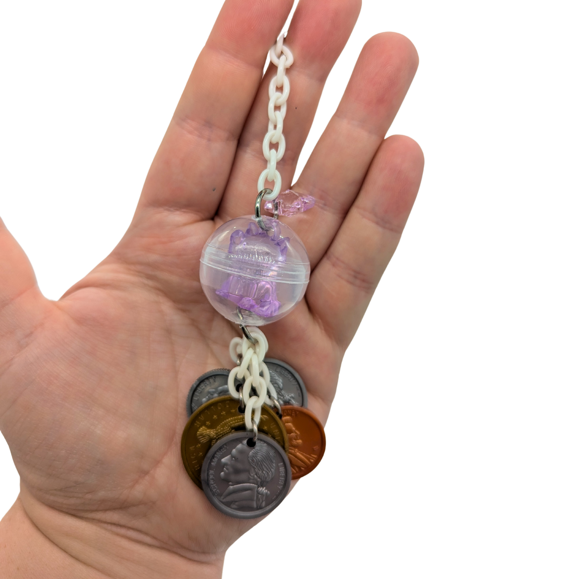 Make your birds work for you! In your dreams, anyway. Inside the little gachapon capsule is a cat charm. Called a Maneki Neko or a "beckoning cat," these little charms are supposed to bring in good fortune. The cats with the right paw raised beckon riches into your home. If the money cat doesn't work, there are also strings of coins hanging below. Listen to that soothing jangle of non-legal tender!