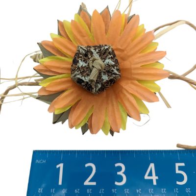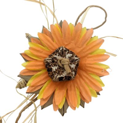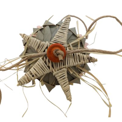 Made with palm flower, vine star, raffia, cupcake liners, and a mahogany pod, this toy is intended to be tied to the side of the cage with the included paper rope.