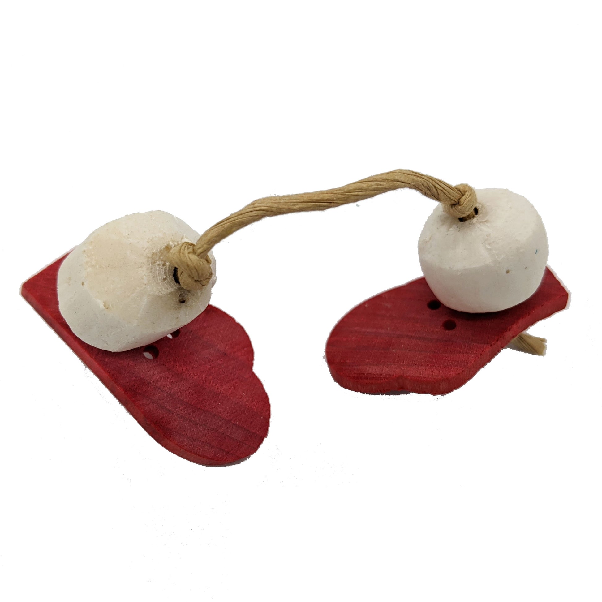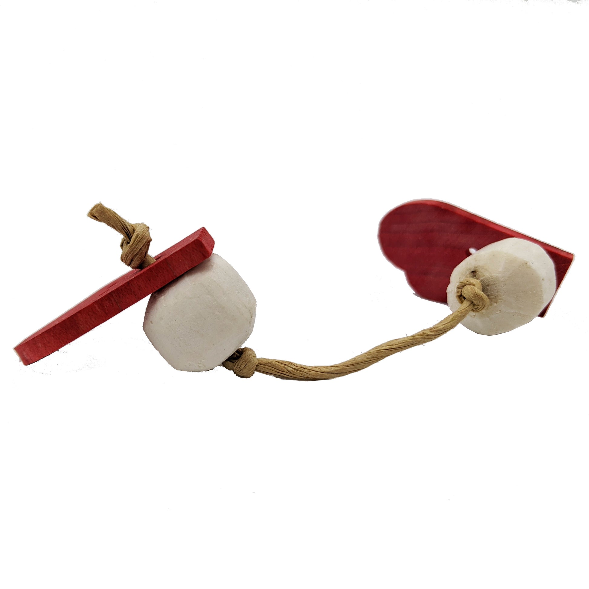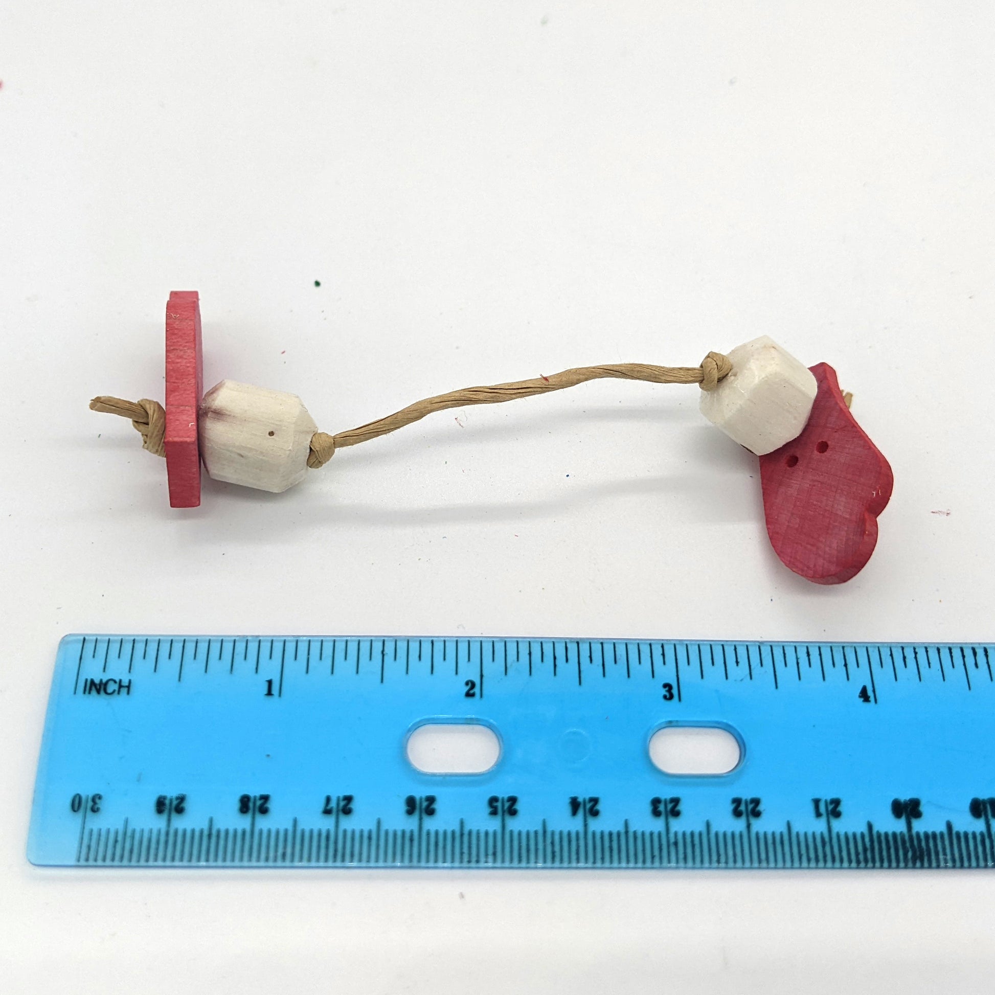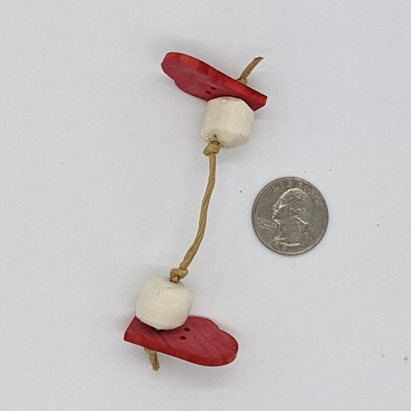 These mini mittens are made from 1/8" hardwood and sola beads. Strung with paper rope.
