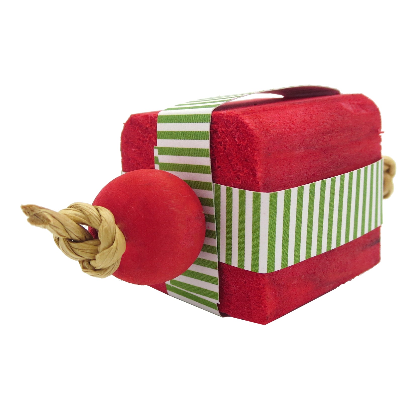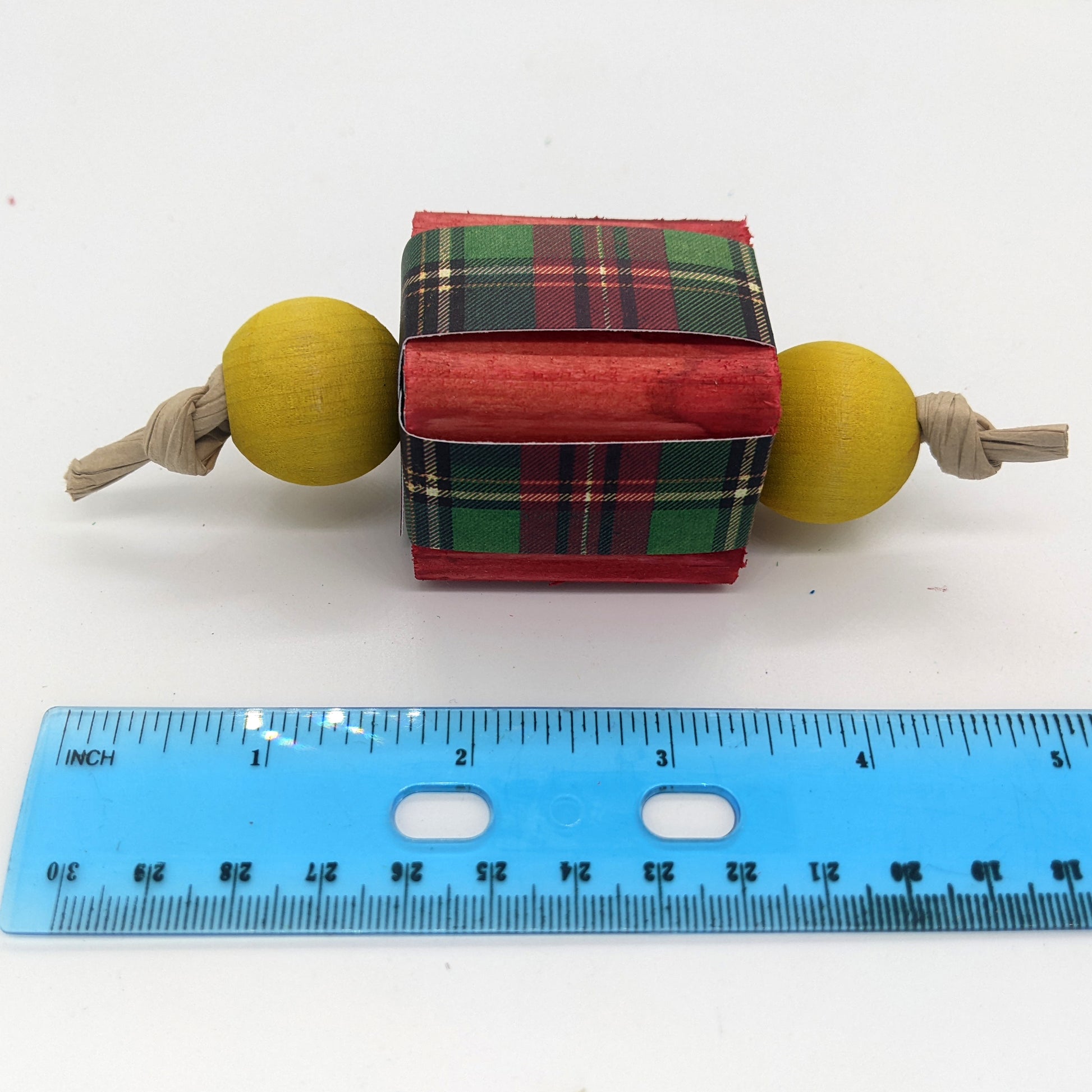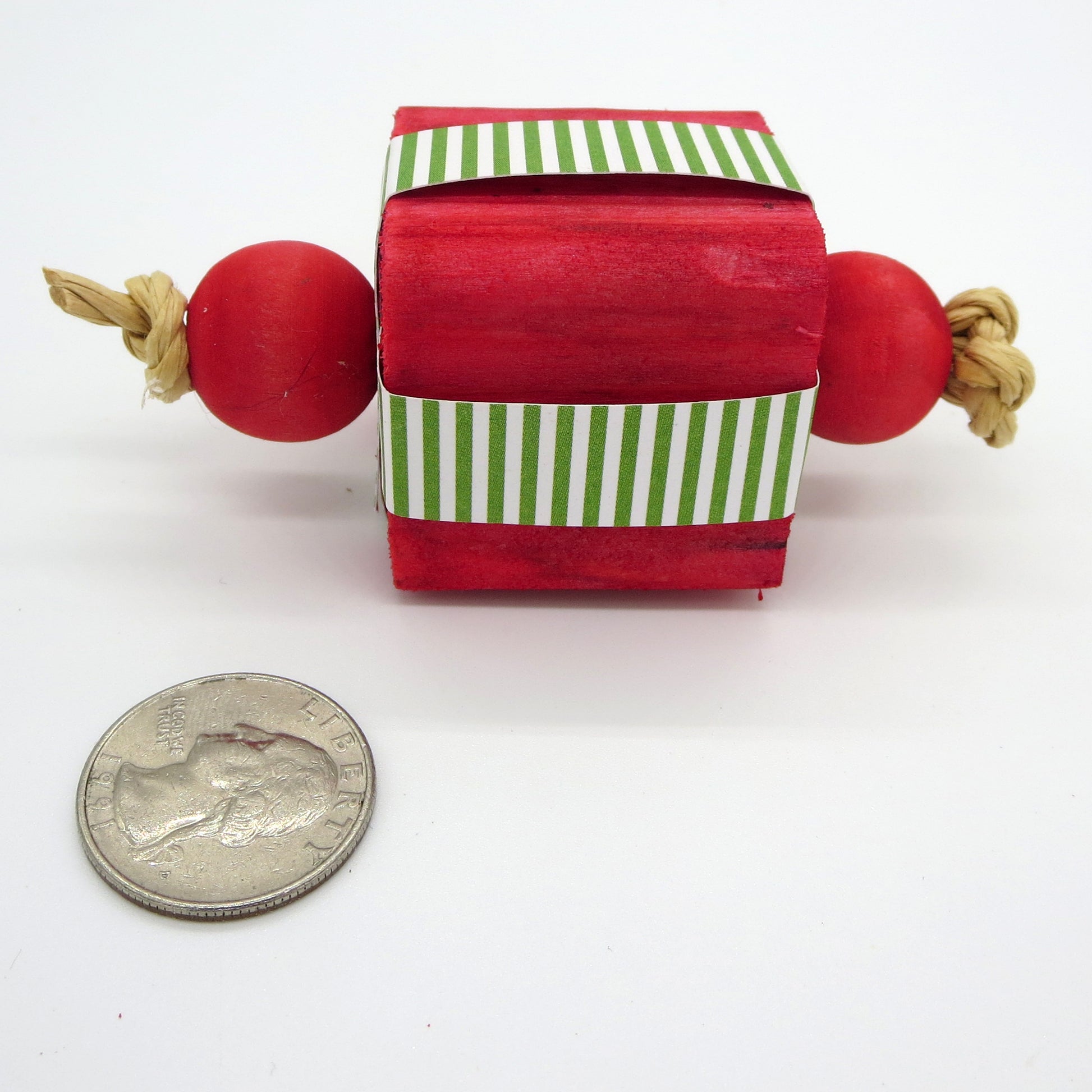 Made with a block of pine, with cardstock ribbon and 1 " wooden beads. Strung on paper rope.