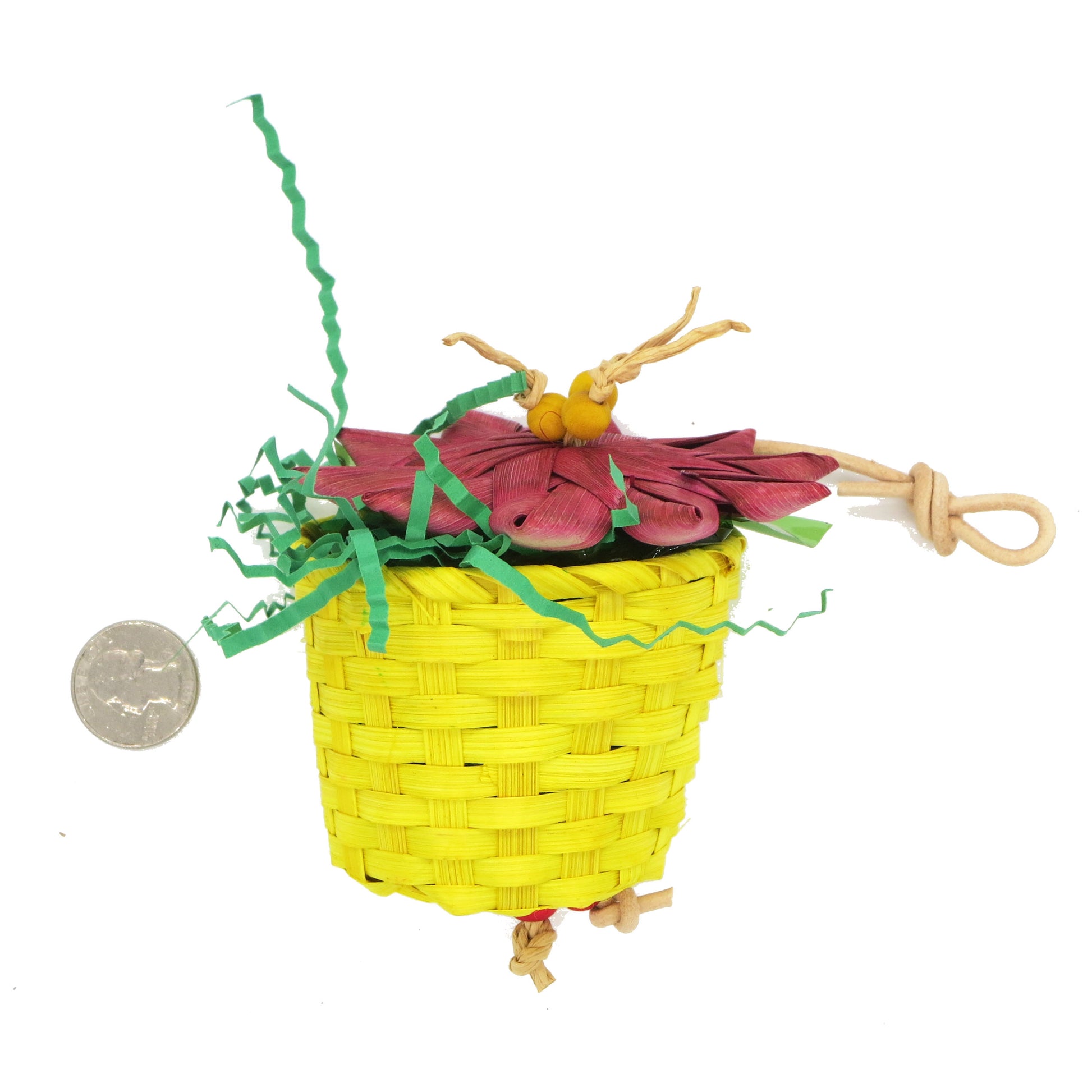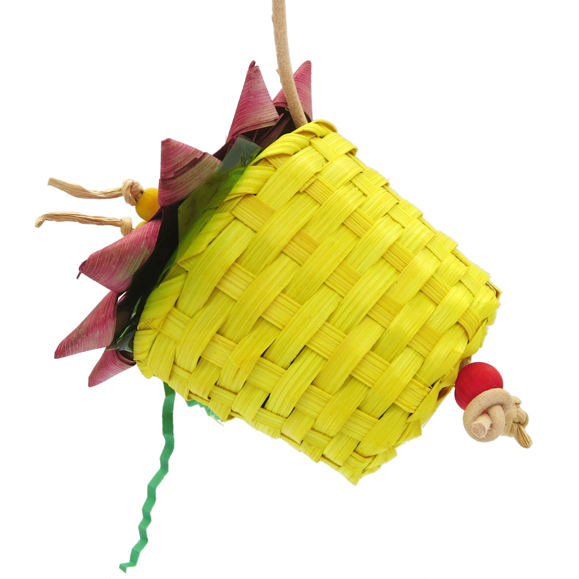 This basket will really let you pack in the goodies and is a great option for beginner or intermediate foraging! I really liked hanging this off the side of a swing so it expanded locations I could add foraging. Your bird can really tear into the basket or move/destroy the flower, lots of fun options to forage with this toy.