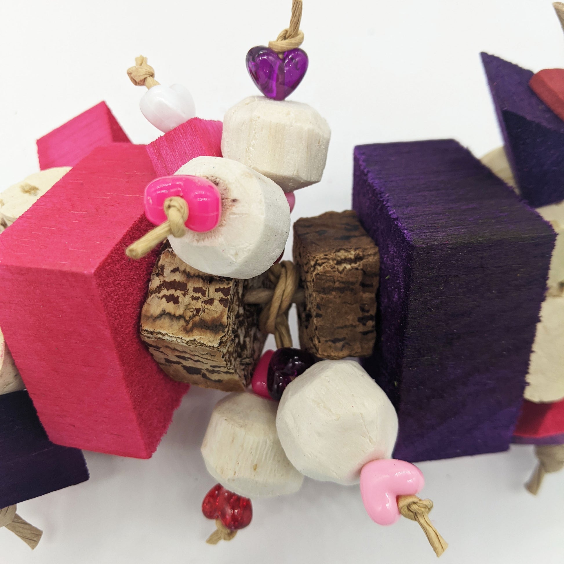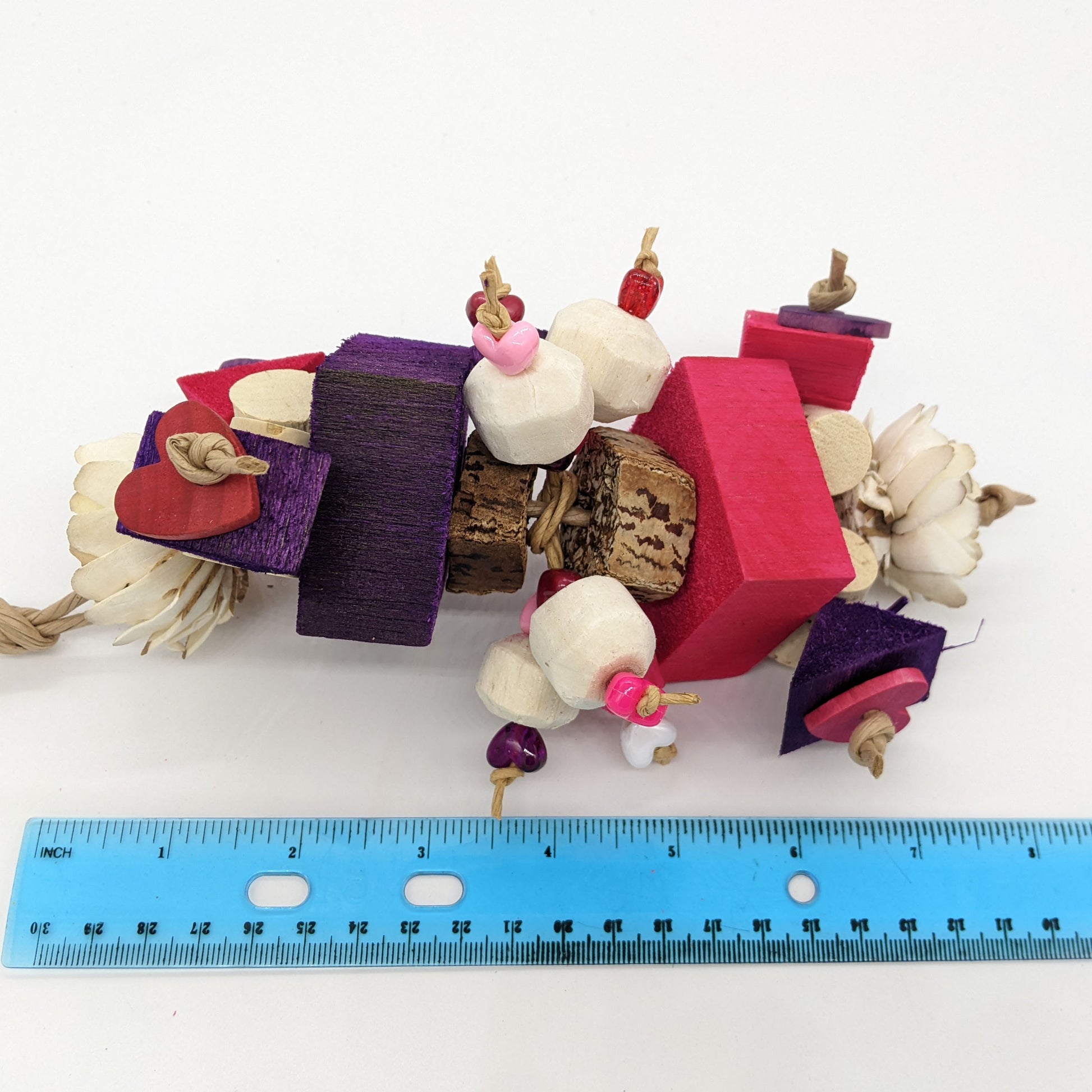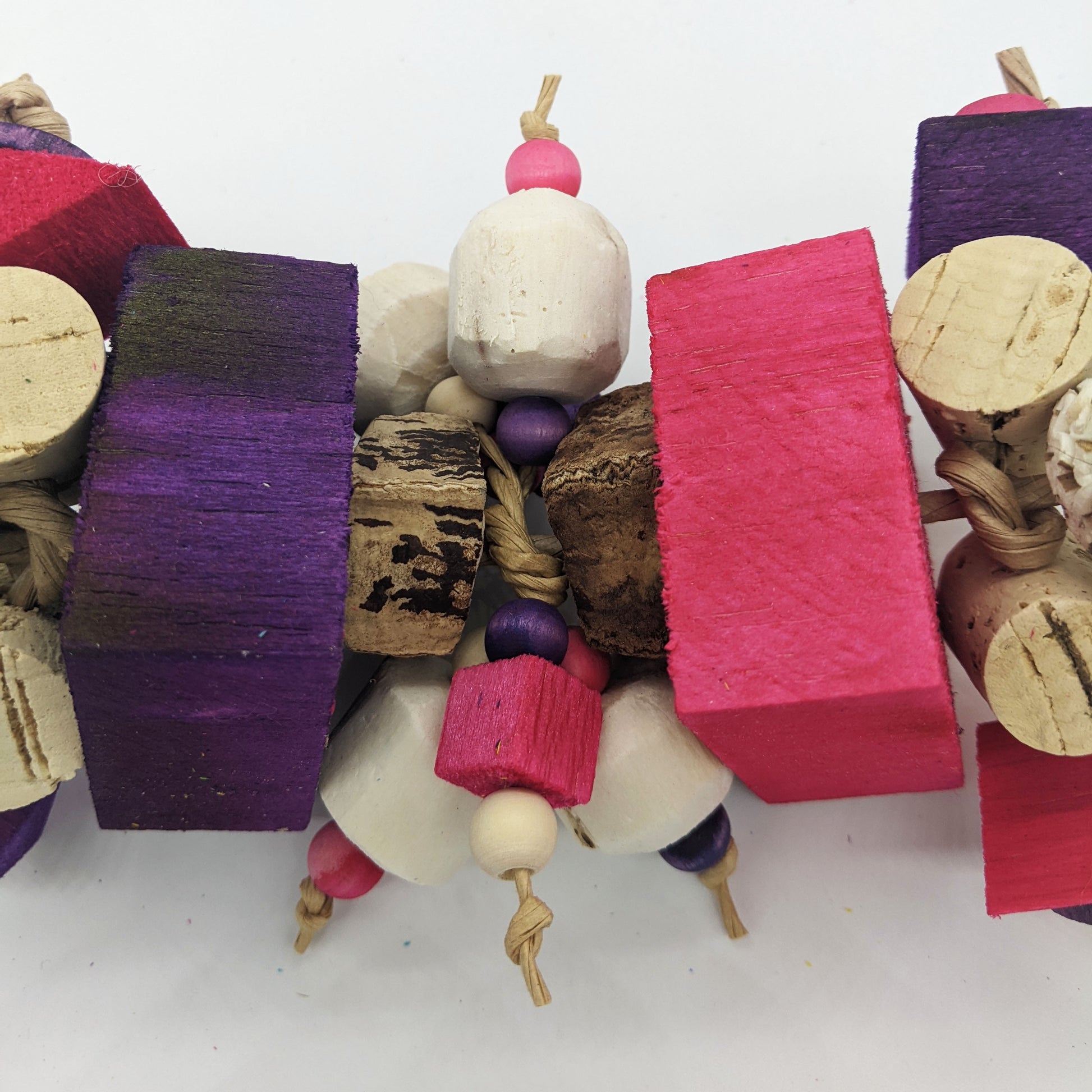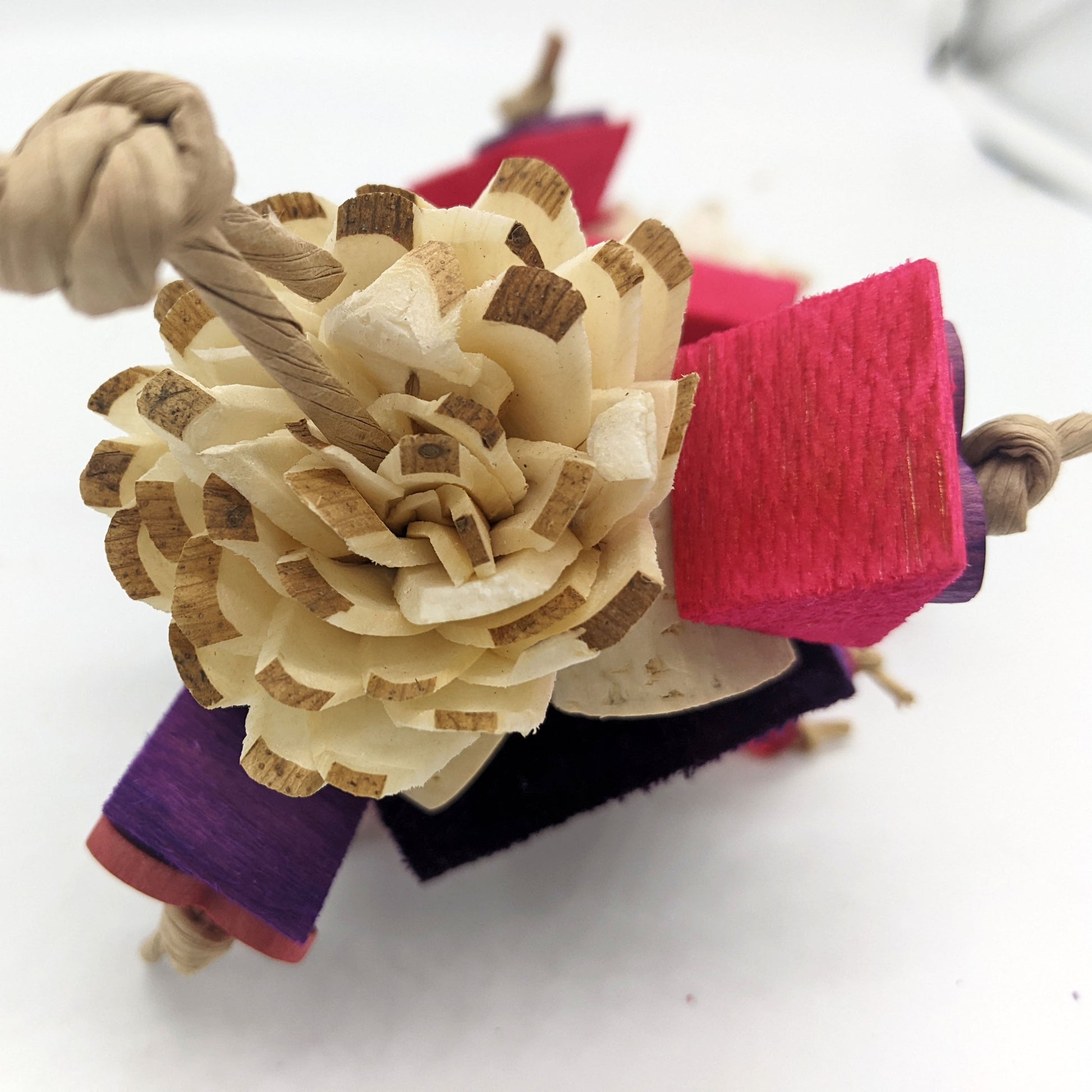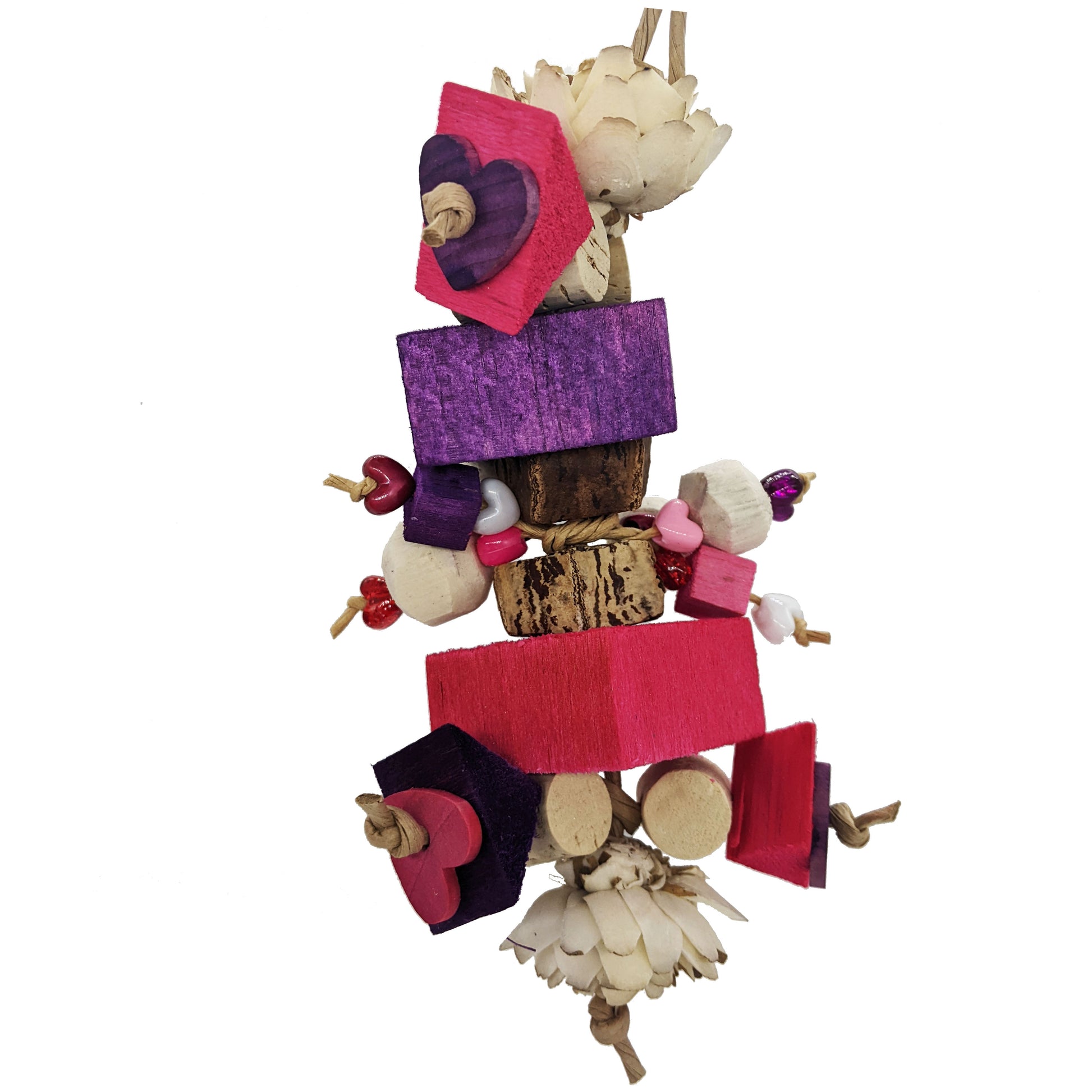 Made with two sola flowers, 1" thick balsa slats, 1" balsa triangles, cork stoppers, sola pieces, heart shaped pony beads (or 10mm wood beads if you avoid plastics), 1/8" thin hardwood hearts, 1/2" balsa cubes, and 1" sola beads. Strung on paper rope.