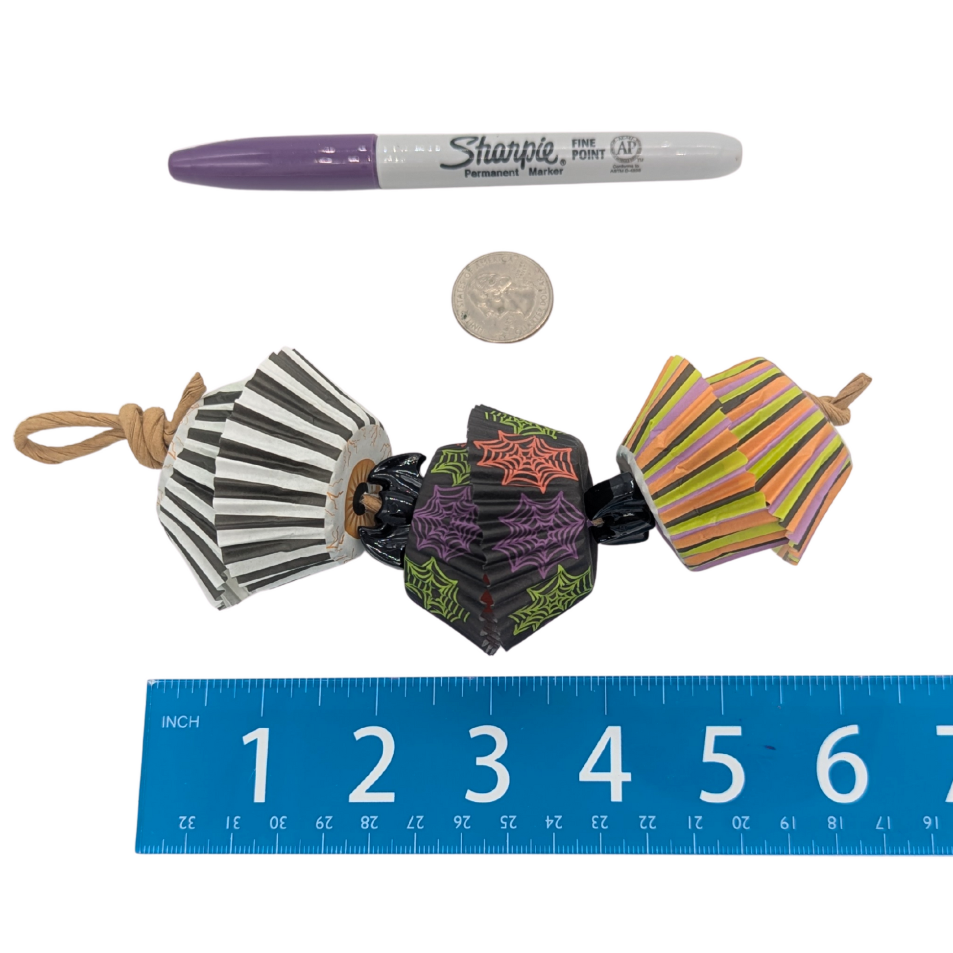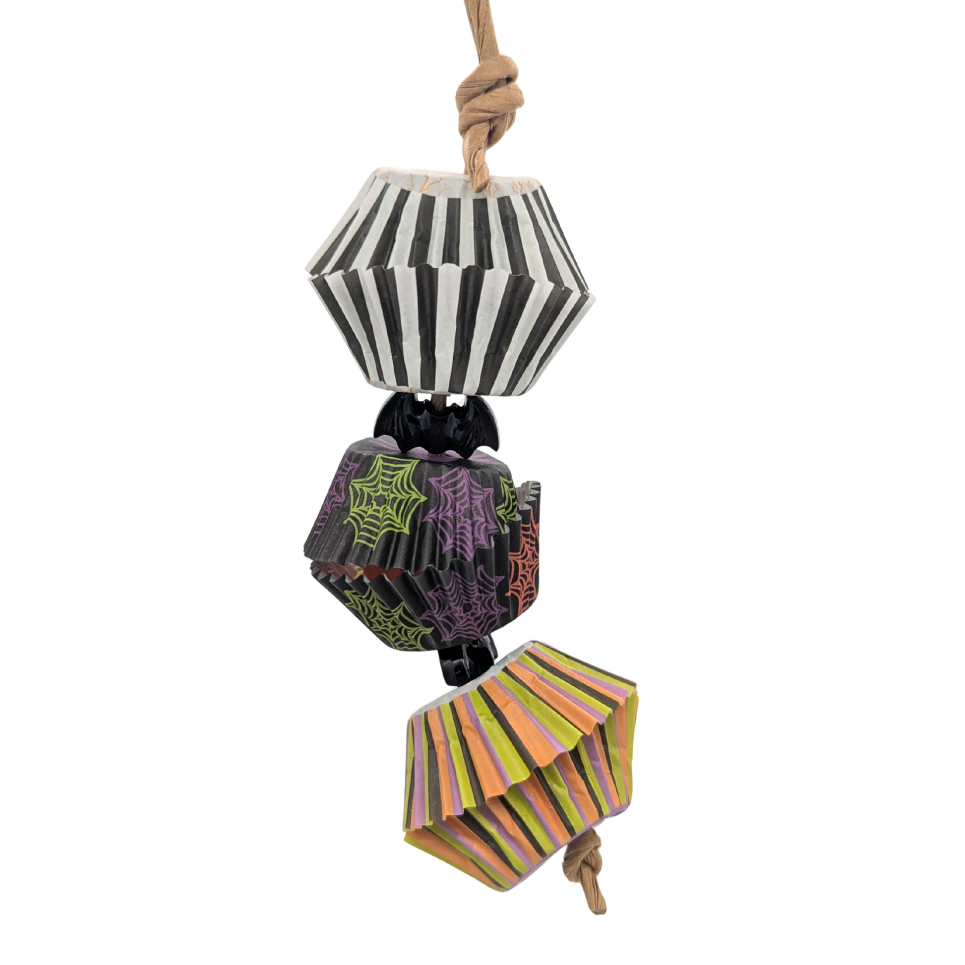 Strung on paper rope with plastic bat beads. Exact patterns will vary.