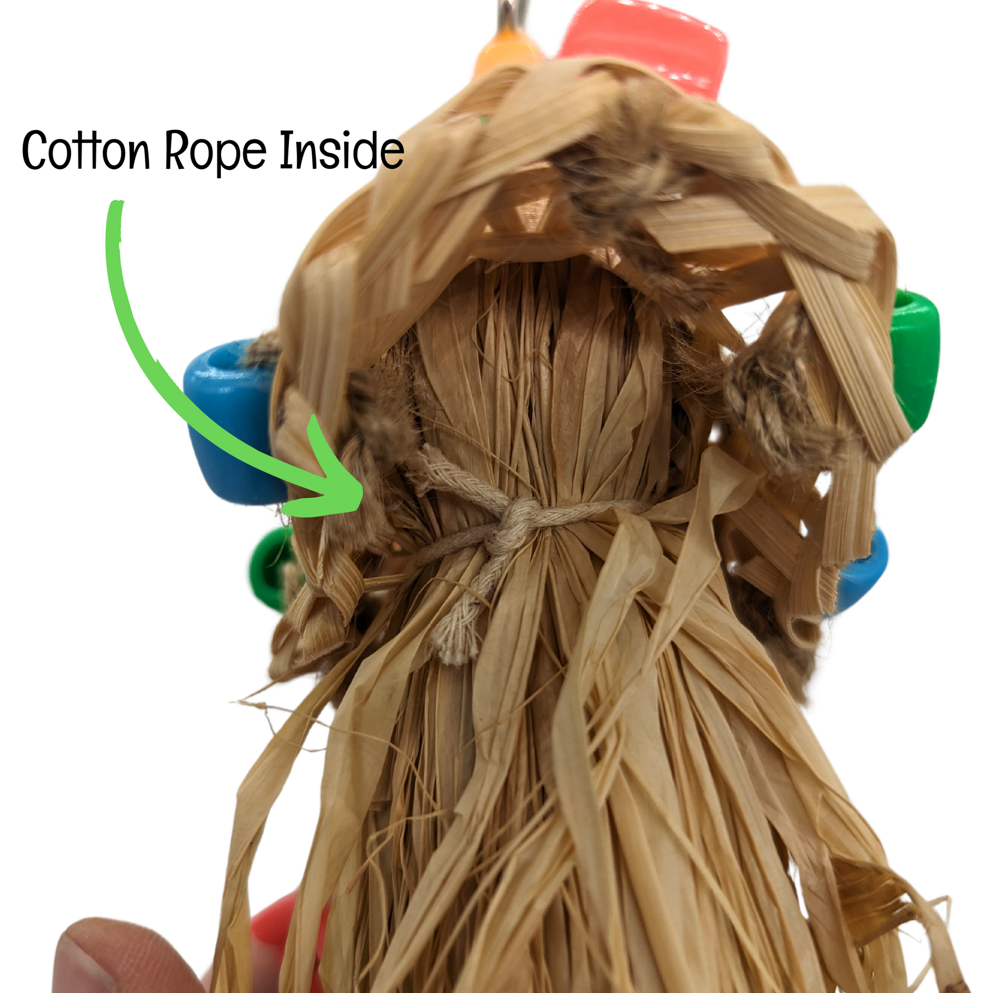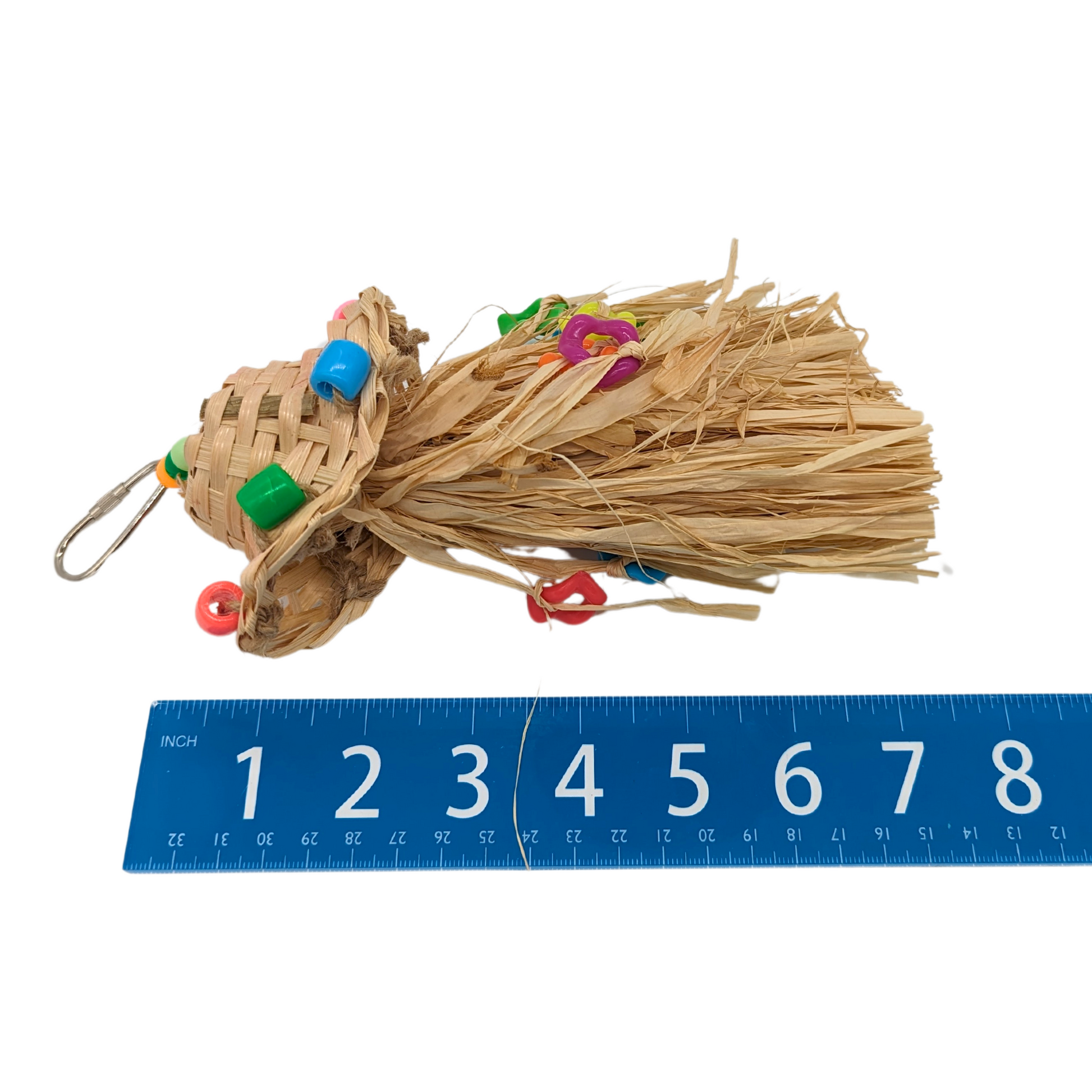 - DESIGN FEATURES - Made with a bamboo hat and tons of fun to preen raffia strands that have been adorned with colorful acrylic beads. Attaches to the cage with a nickel plated pear link.