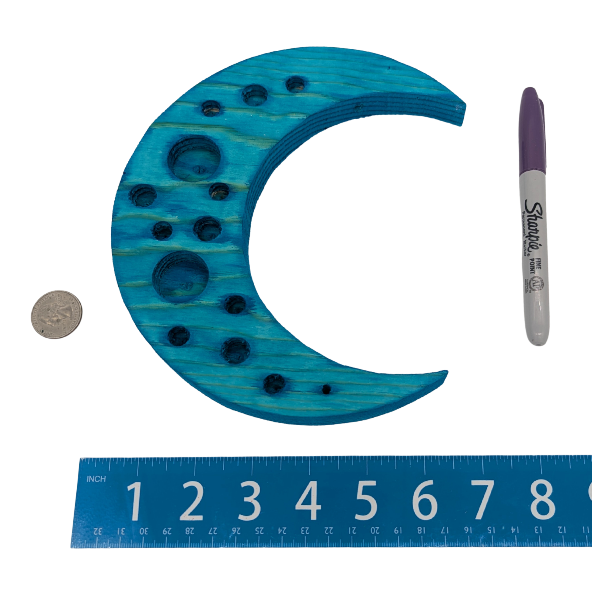 A 3/4" thick moon serves as a perfect swing spot for smaller birds! Decorated with 3/8 and 1/2" wood balls, a 1/4" thick hardwood star, and sparkly pony beads. Strung on paper rope. Also has two empty holes to hide treats in!