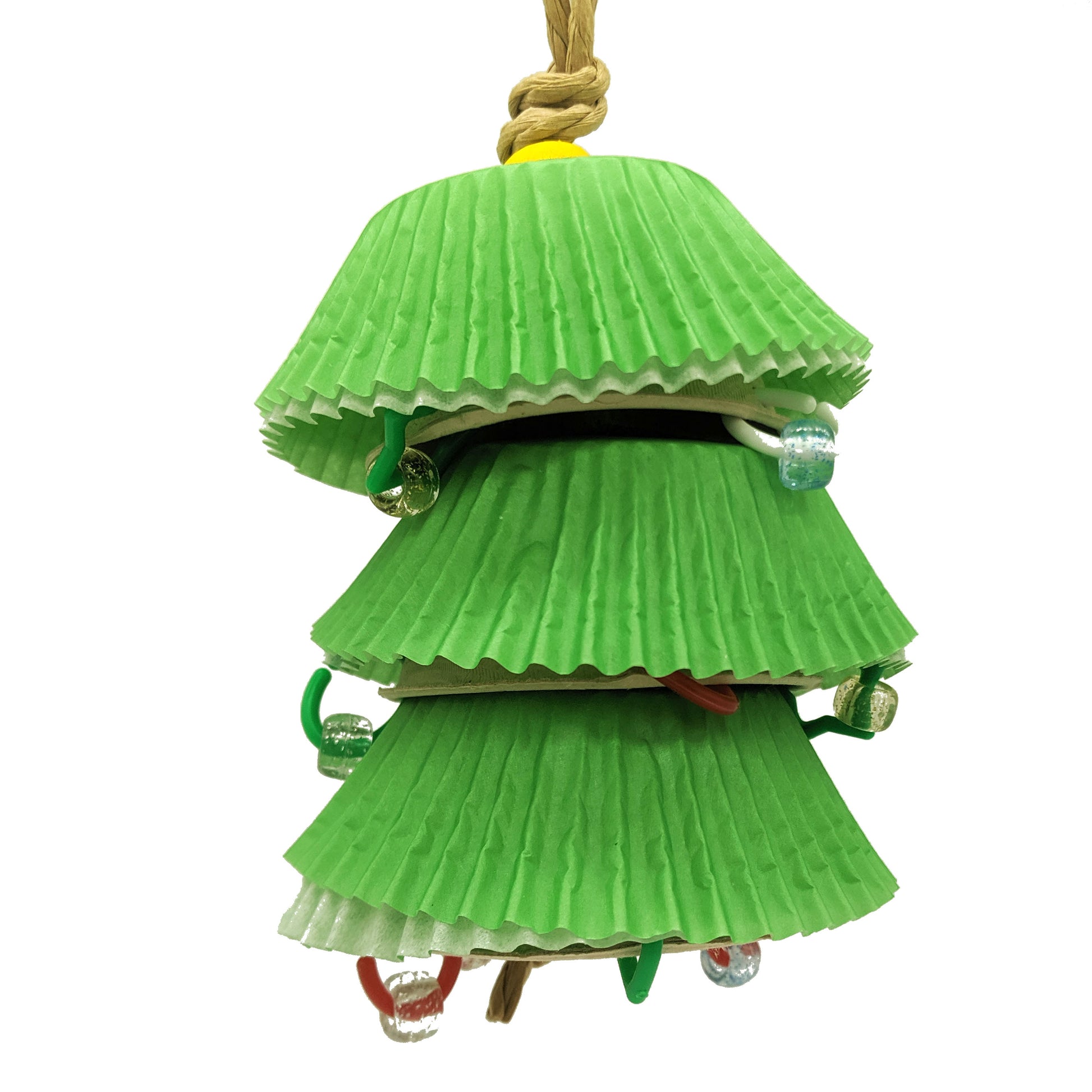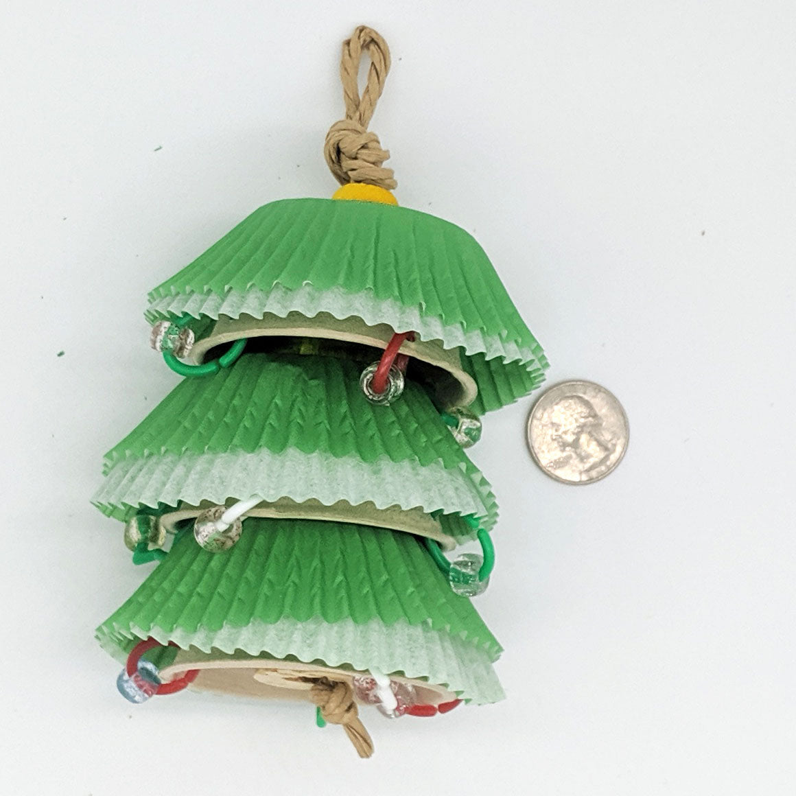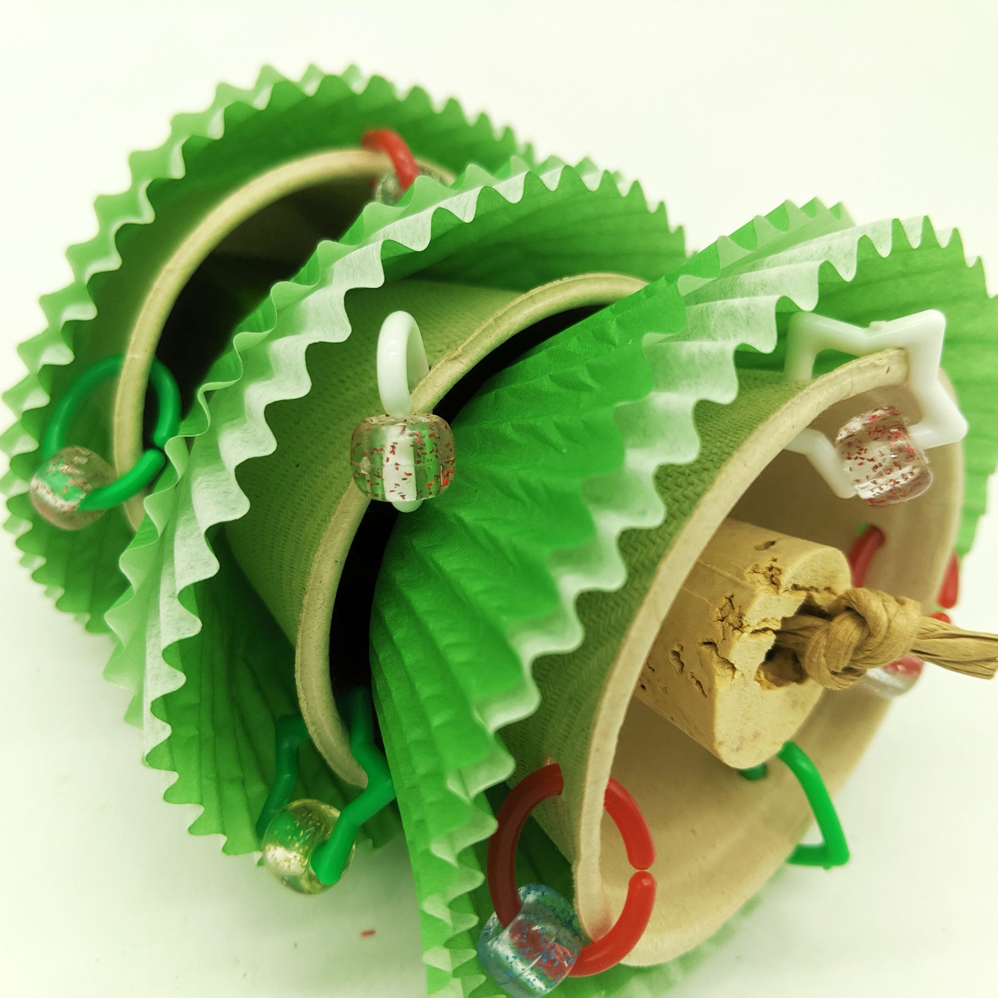 Made with wheat fiber cups, cupcake liners, hidden balsa and pieces of cork, this toy also features small Christmas pony beads on mini links to beak and shake!